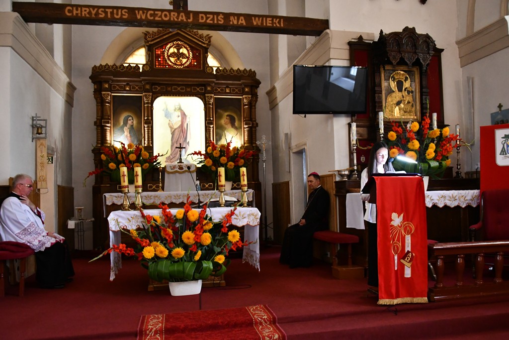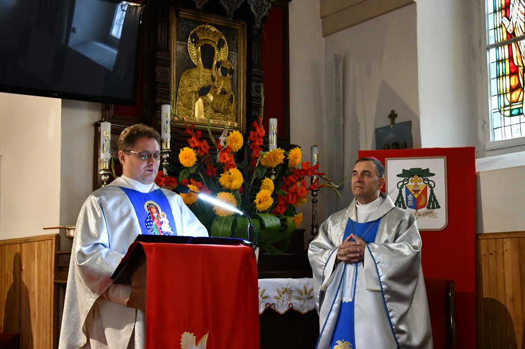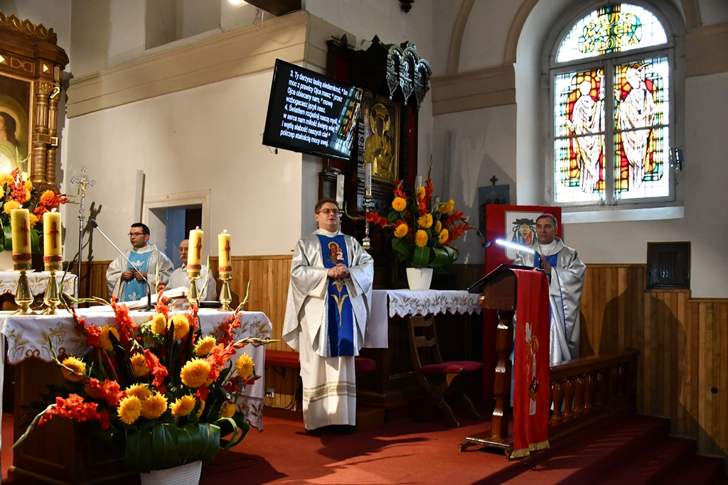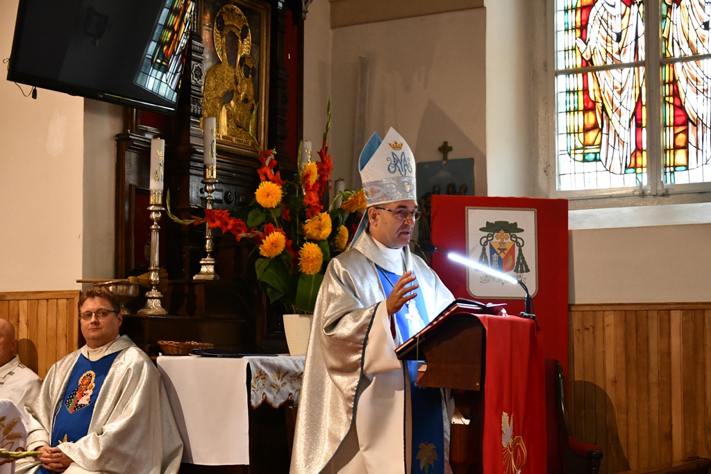 W homilii biskup nawiązał do wszystkich trzech wydarzeń, które zgromadziły parafian oraz przybyłych gości. Podkreślił szczególnie postać Matki Najświętszej. Jak zaznaczył, „u podstaw czci okazywanej Maryi leży oczywiście Osoba Chrystusa. Z Jego powodu została wybrana przed wiekami, a potem, po długim okresie oczekiwania, gdy przyszedł właściwy moment, aby Bóg stał się człowiekiem, właśnie z Maryi wziął ludzkie ciało”.