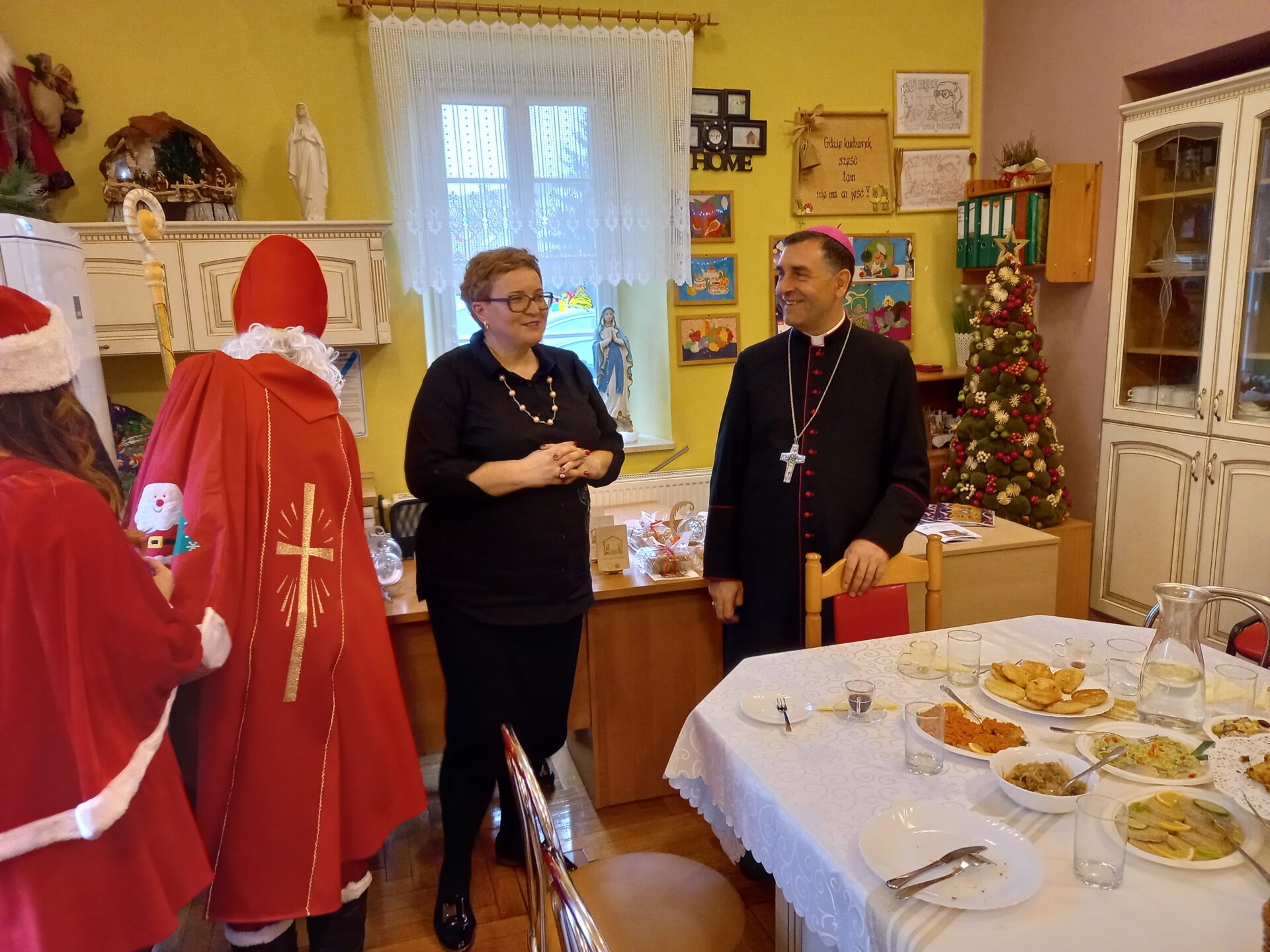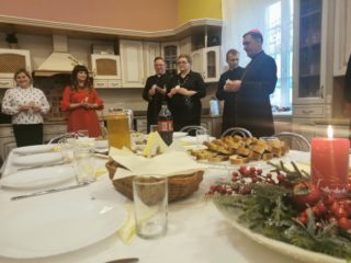 W bożonarodzeniowych życzeniach skierowanych do nas przez ks. biskupa zostało podkreślone ponadczasowe przesłanie wystawionej sztuki. Nasz gość następnie odwiedził wszystkie pracownie. Nie obyło się bez wspólnego kolędowania, dzielenia się opłatkiem i składania życzeń. Wigilijne spotkanie zwieńczyła wspólna agapa, na której nie zabrakło pierogów, kapusty z grzybami, śledzi, pysznych makowcy i kompotu z suszu. Nieodzownym elementem takich spotkań jest wręczanie prezentów, które na niejednej twarzy wywołały uśmiech.  Mamy nadzieję, że w atmosferze wspólnego kolędowania i życzliwości spotkamy się za rok.