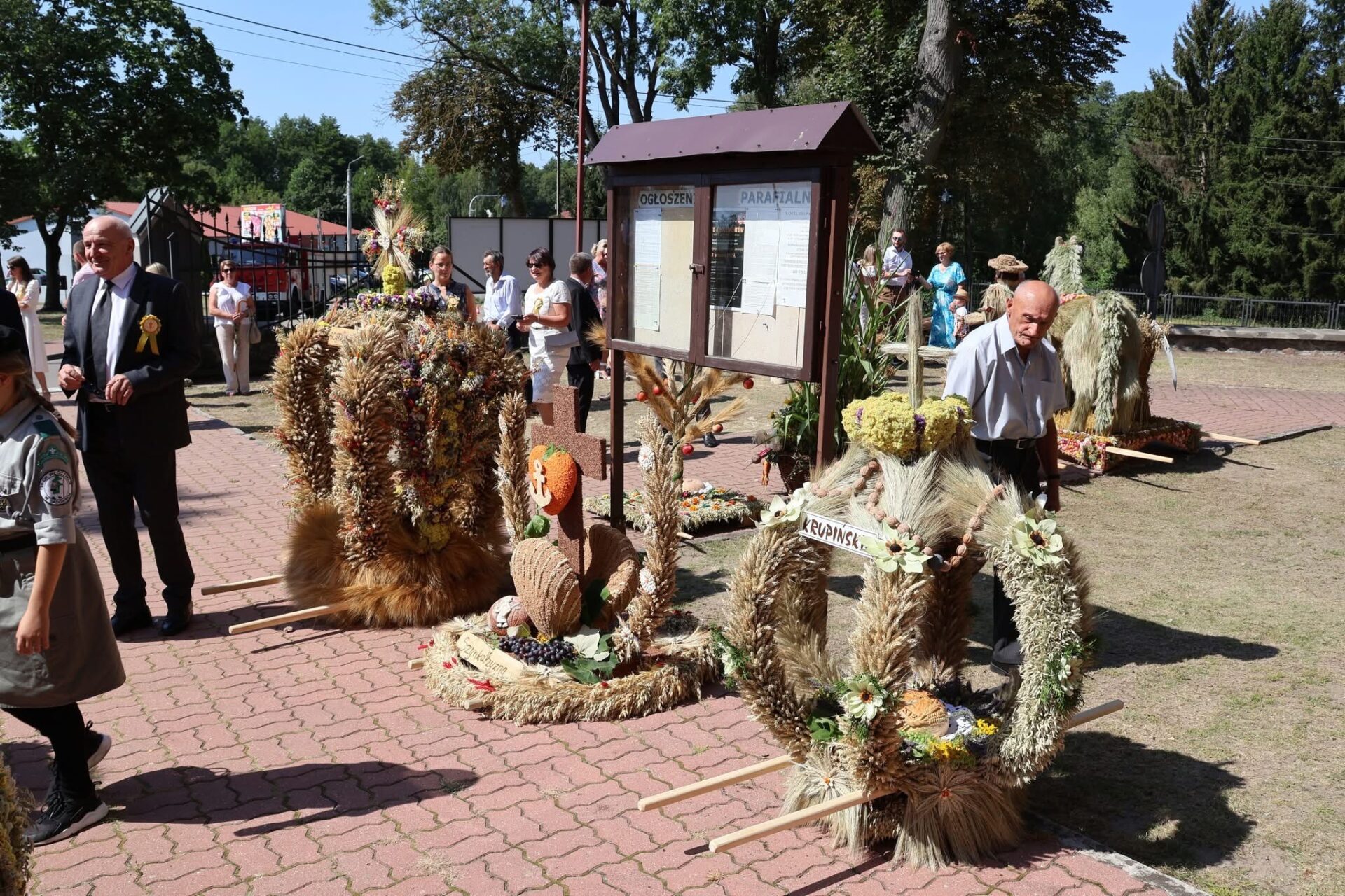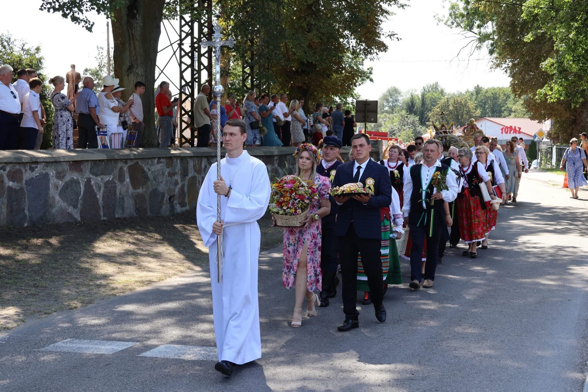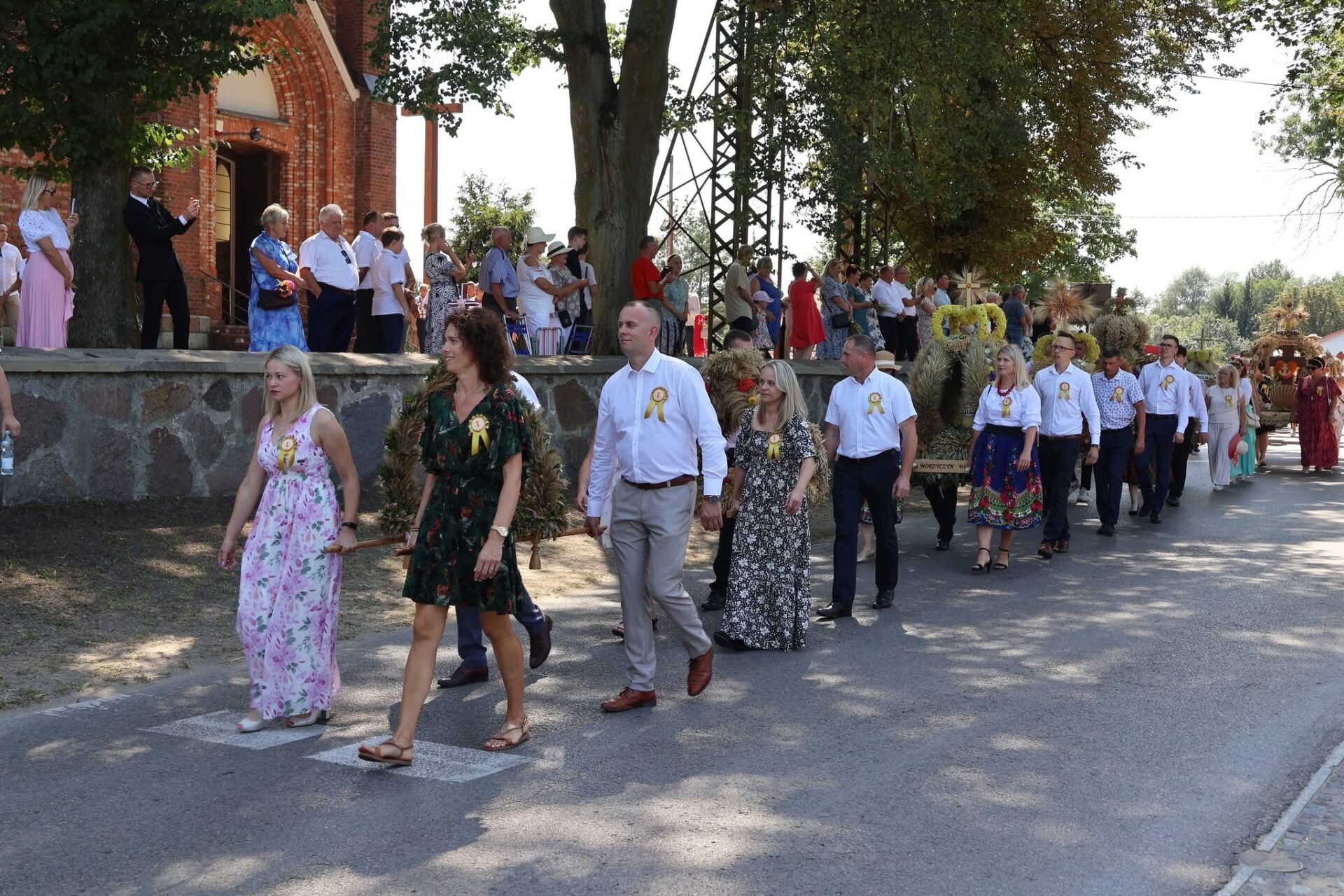 Po Eucharystii przed świątynią ustawił się korowód z wieńcami dożynkowymi, który przemaszerował na plac za kościołem na dalszą część uroczystości, podczas których odbyło się tradycyjne dzielenie chlebem. Był to symboliczny gest wdzięczności za zebrane plony, a także wyraz wspólnoty i gościnności.