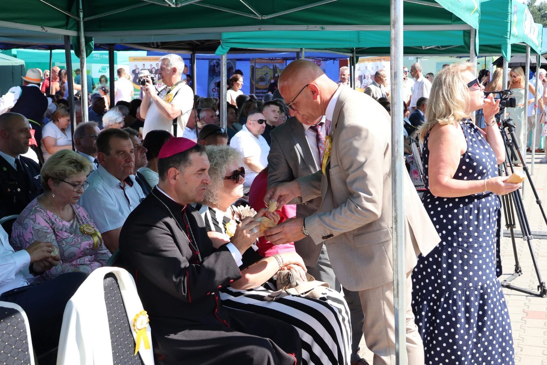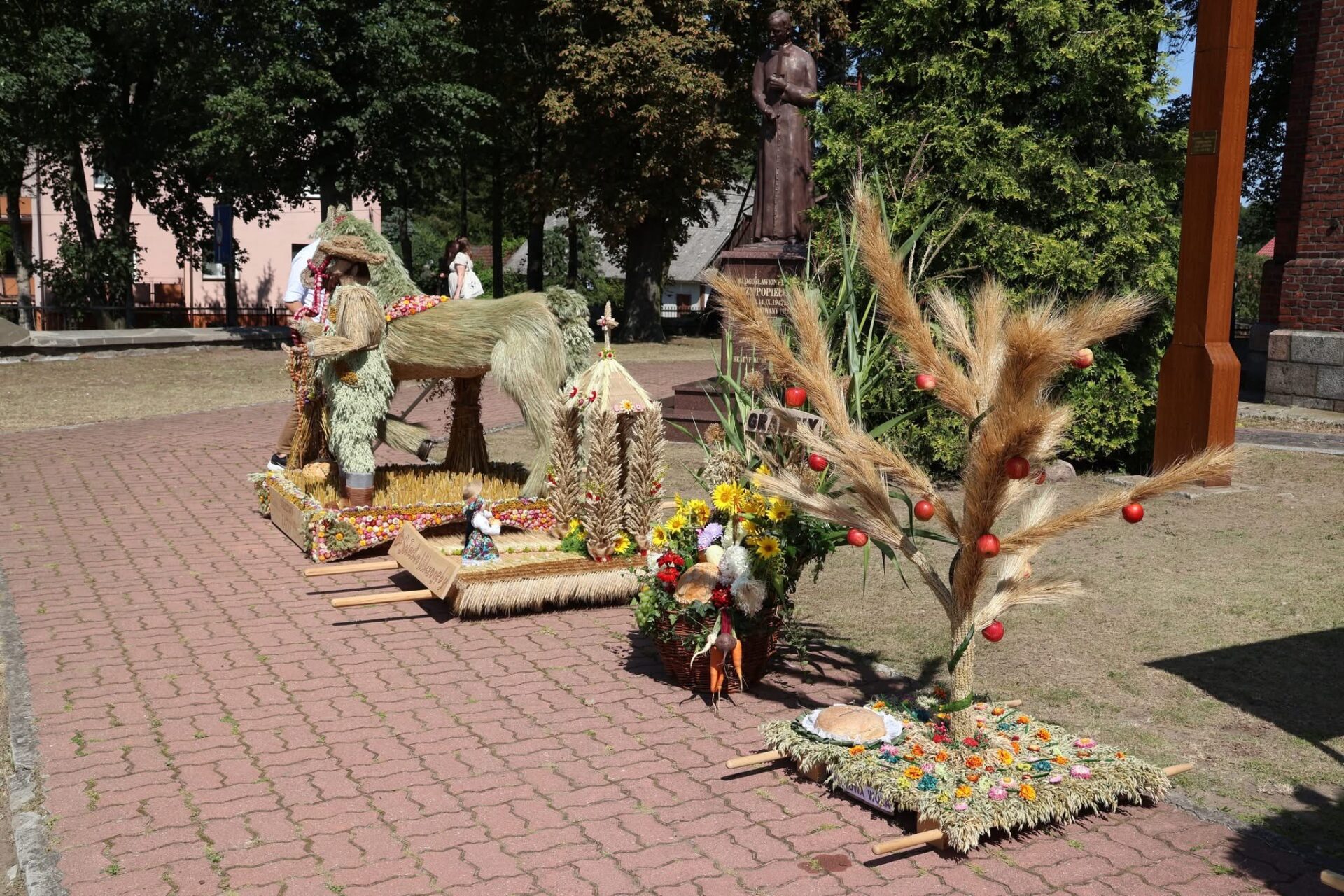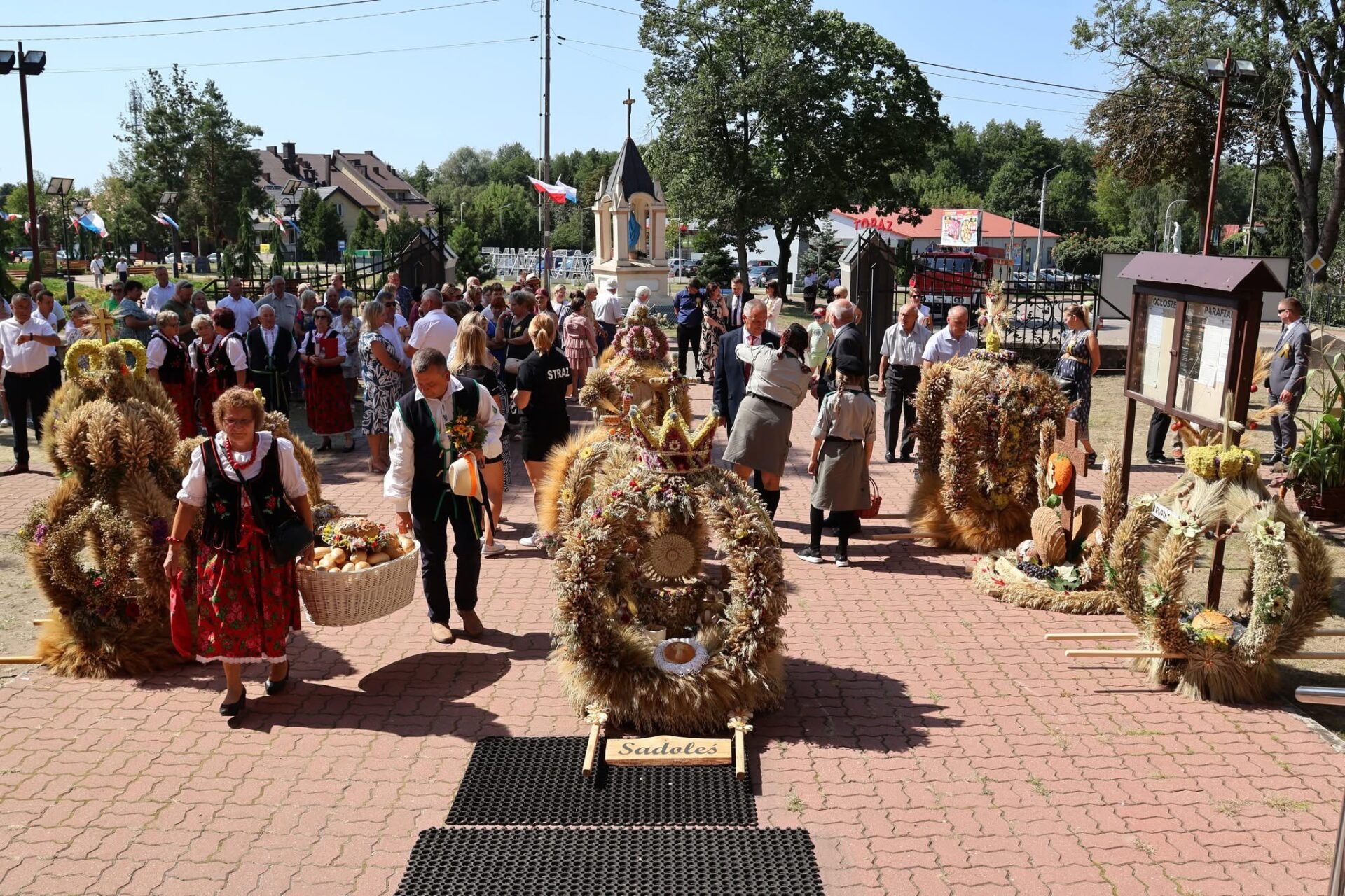 Po Eucharystii przed świątynią ustawił się korowód z wieńcami dożynkowymi, który przemaszerował na plac za kościołem na dalszą część uroczystości, podczas których odbyło się tradycyjne dzielenie chlebem. Był to symboliczny gest wdzięczności za zebrane plony, a także wyraz wspólnoty i gościnności.