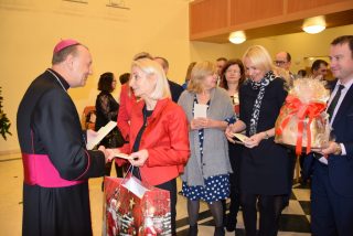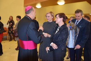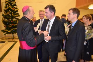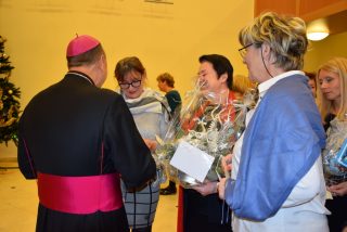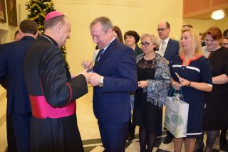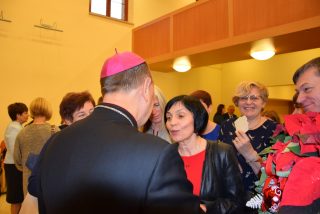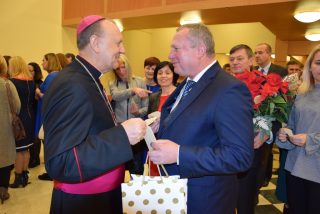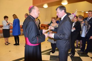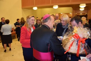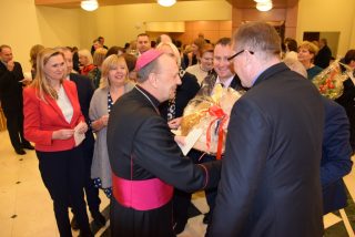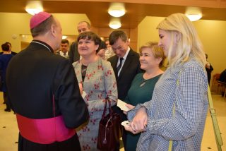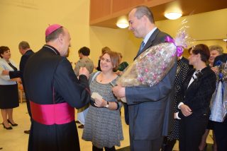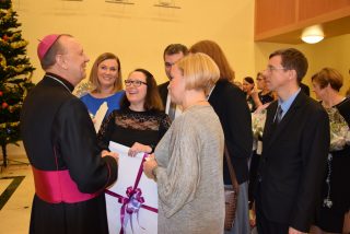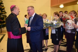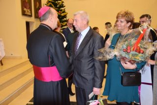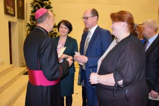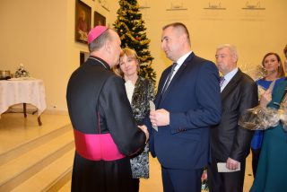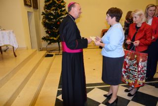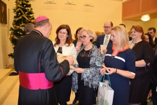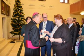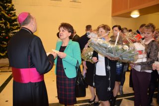 W imieniu zebranych na ręce Pasterza diecezji życzenia złożyli przedstawiciele Zespołu Szkolno-Przedszkolnego w Narwi na czele z dyrektorami placówki i ks. prał. Zbigniewem Niemyjskim, dziekanem hajnowskim. Swoją obecnością zaszczyciła także Beata Pietruszka, Podlaski Kurator Oświaty, która wyraziła radość ze wspólnego spotkania oraz łamania się opłatkiem. Podziękowała także za dotychczasową bardzo dobrą współpracę na linii diecezja drohiczyńska-kuratorium. – Spotkałam się tu z dużą życzliwością, co sprawia, że bardzo chętnie przyjeżdżam do Drohiczyna – zaznaczyła kurator. Podziękowała także za stworzoną możliwość spotkania się z dyrektorami szkół i placówek oświatowych na terenie diecezji drohiczyńskiej. Z okazji nadchodzących świat życzyła zgromadzonym radości z narodzin Bożego Dzieciątka. – Niech te święta spędzone w rodzinnym gronie  będą pełne zdrowia, szczęścia i wszelkiej pomyślności, a nadchodzący Nowy Rok przyniesie dużo spokoju i dobra – powiedziała Podlaski Kurator Oświaty.