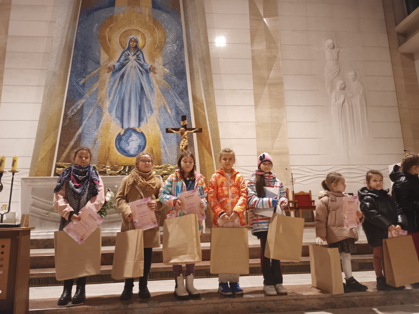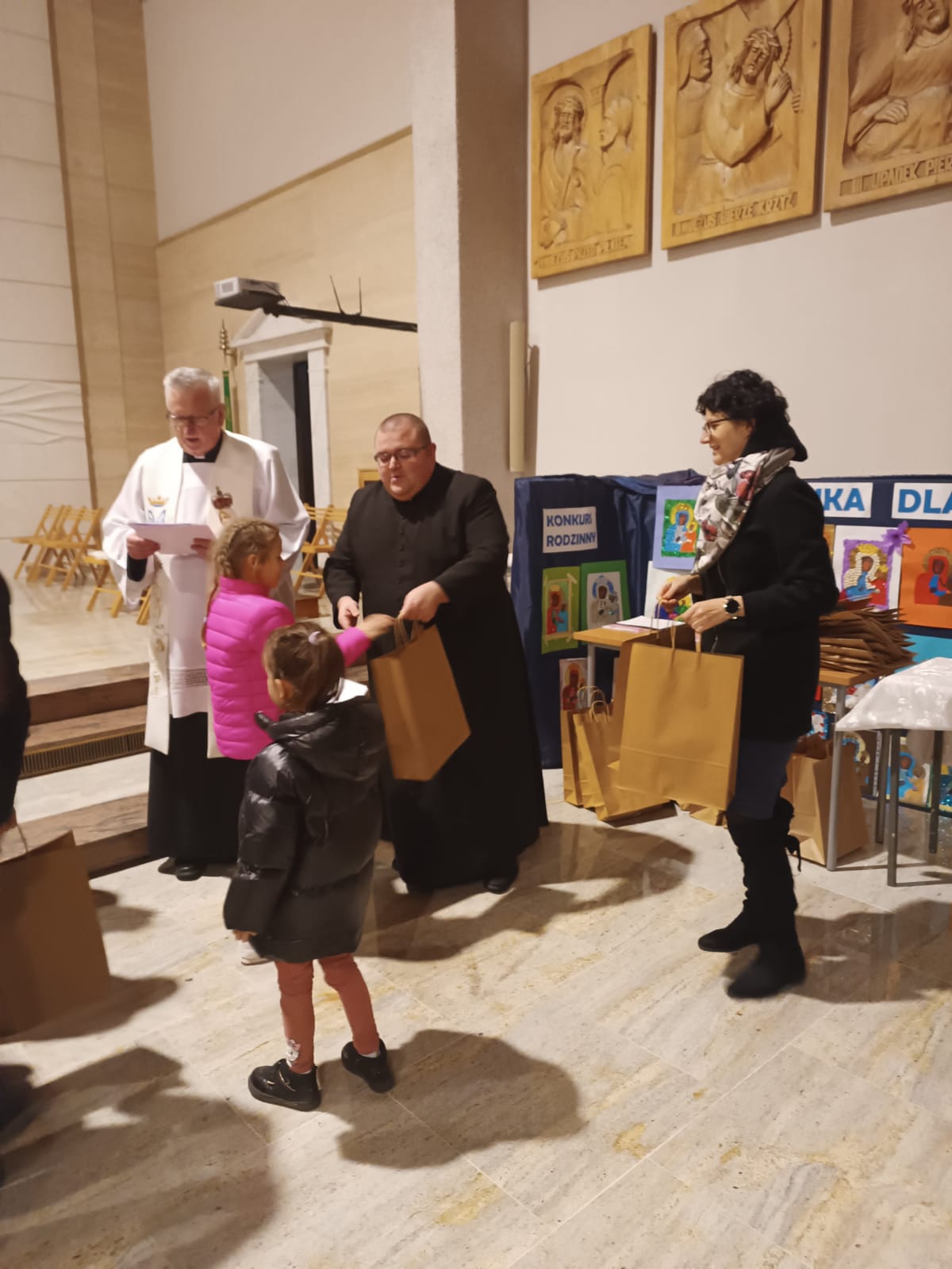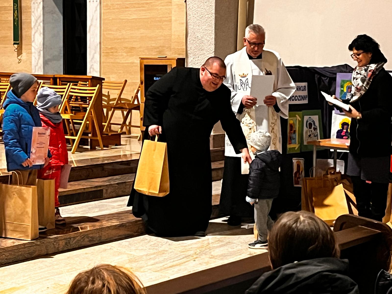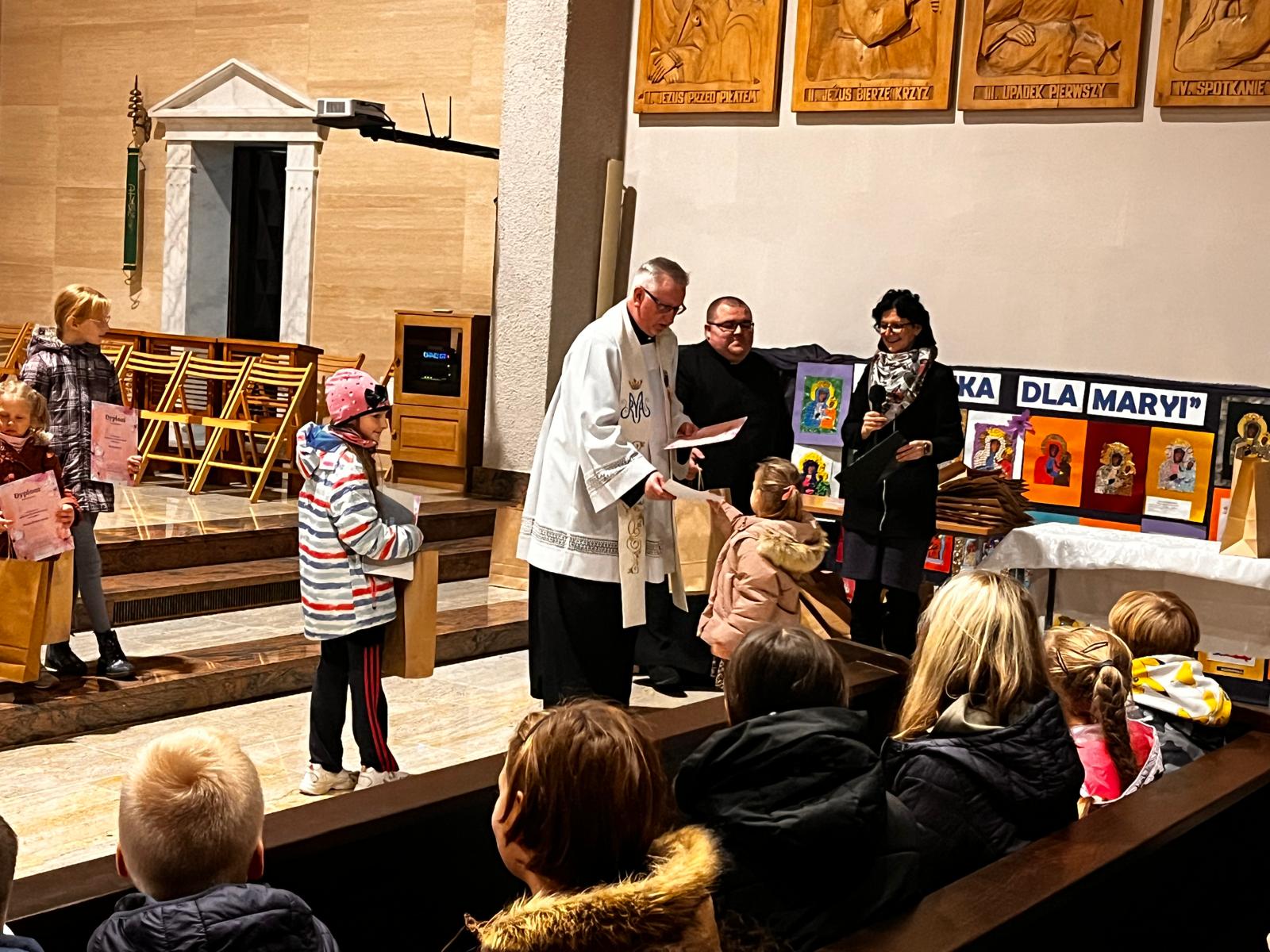 W finał konkursu poprowadzili we dwójkę ks. Roman Szmurło – proboszcz parafii oraz Paulina Białek – katechetka. Proboszcz, wyraził wielkie uznanie dzieciom, za prace artystyczne, które wykonali i wyraził nadzieję, że takie inicjatywny przyczynią się do wzrostu miłości ku Matce Bożej wśród najmłodszych. Następnie wraz z Pauliną Białek oraz ks. Beniaminem Sęktasem wręczyli wszystkim uczestnikom prezenty i podziękowania.