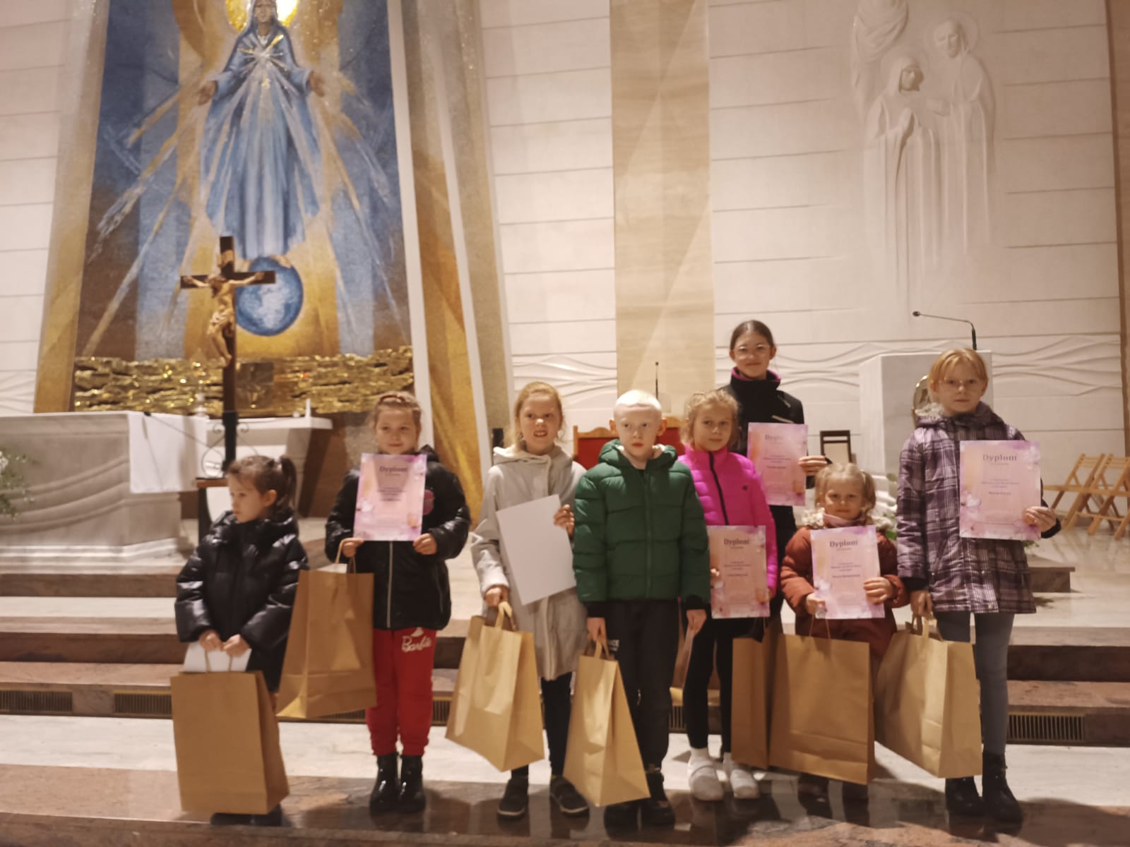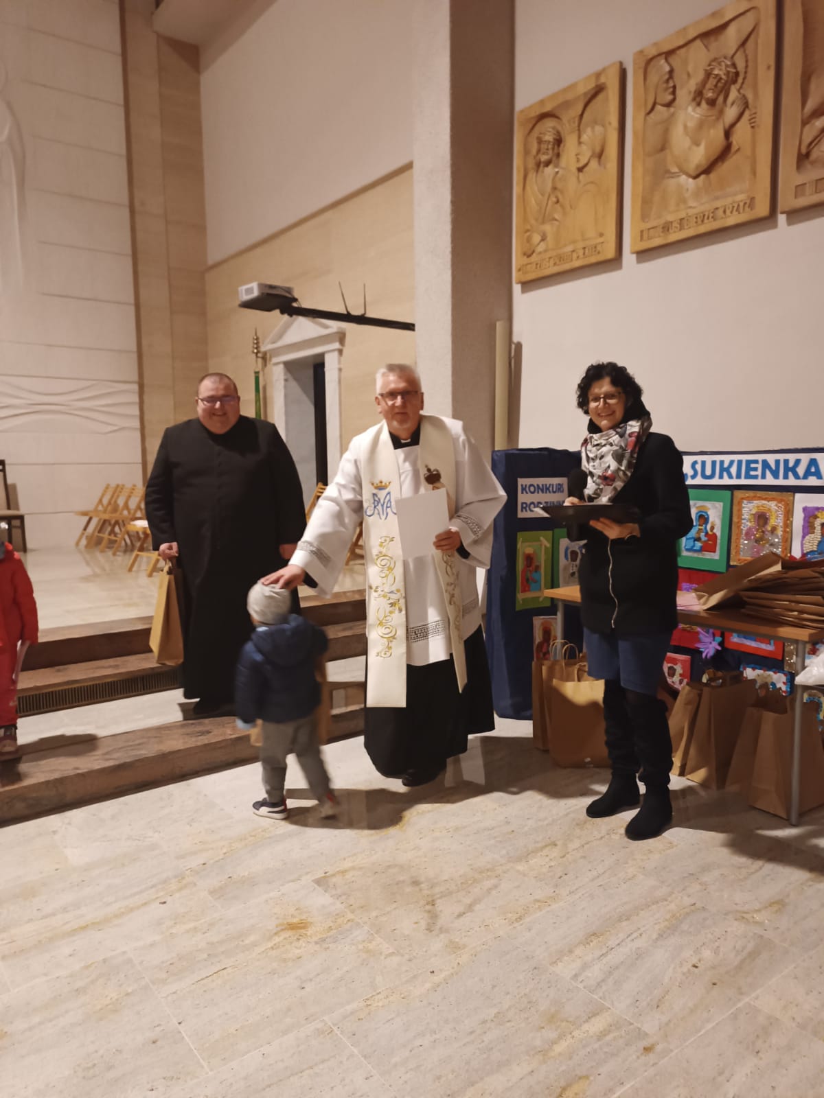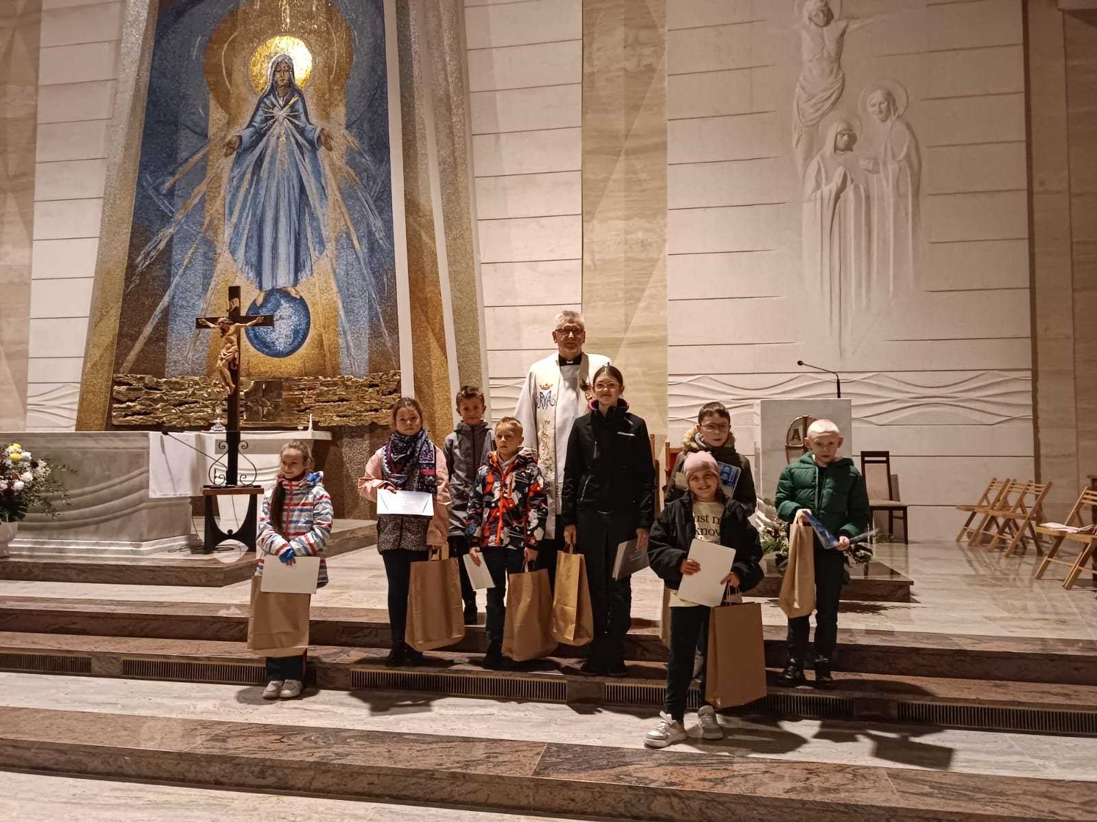W finał konkursu poprowadzili we dwójkę ks. Roman Szmurło – proboszcz parafii oraz Paulina Białek – katechetka. Proboszcz, wyraził wielkie uznanie dzieciom, za prace artystyczne, które wykonali i wyraził nadzieję, że takie inicjatywny przyczynią się do wzrostu miłości ku Matce Bożej wśród najmłodszych. Następnie wraz z Pauliną Białek oraz ks. Beniaminem Sęktasem wręczyli wszystkim uczestnikom prezenty i podziękowania.