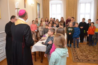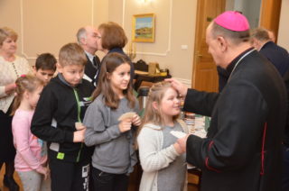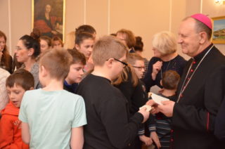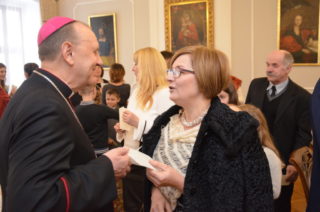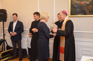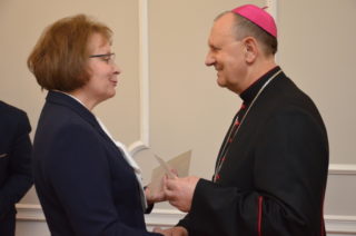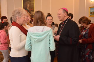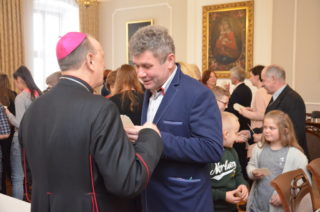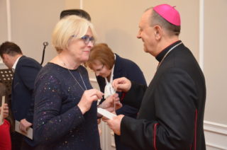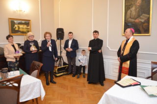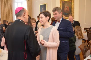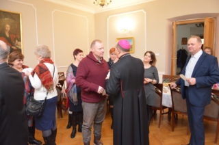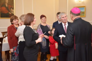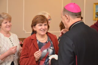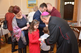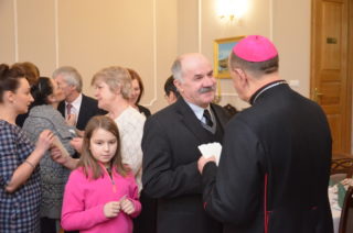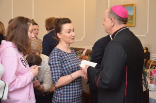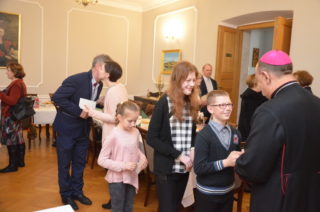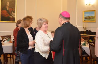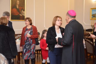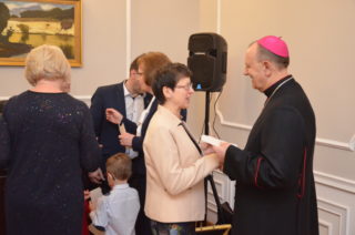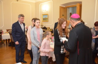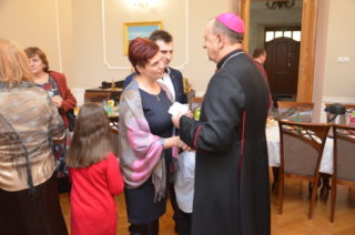 Kolejna część spotkania odbyła się w sali konferencyjnej. W imieniu przybyłych życzenie ks. Biskupowi złożyła Joanna Wilgocka – diecezjalny doradca życia rodzinnego. Natomiast Ekscelencja, zwracając się do przybyłych, przypomniał prawdę o Bogu miłującym, który jako pierwszy umiłował każdego człowieka.