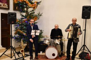 Kolejna część spotkania odbyła się w auli Wyższego Seminarium Duchownego w Drohiczynie. Tu dla wszystkich zgromadzonych, kolędy i pastorałki a także utwory karnawałowe zagrała kapela z terenu gminy Drohiczyn, której liderem jest pan Wiesław Harbaszewski, sołtys wsi Arbasy.