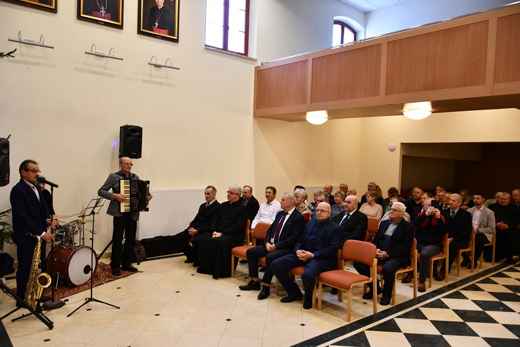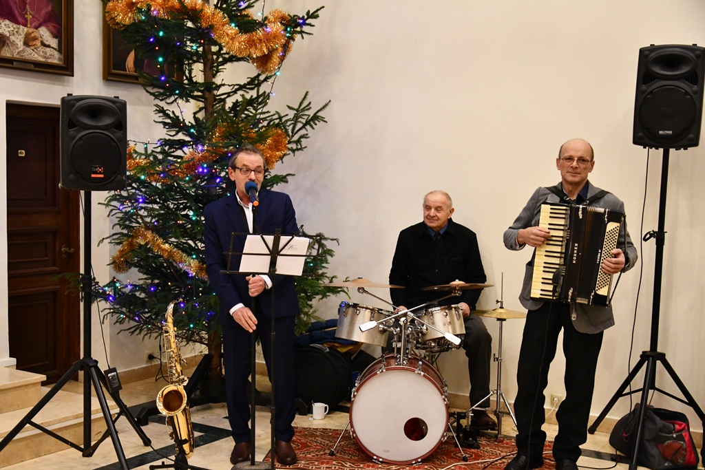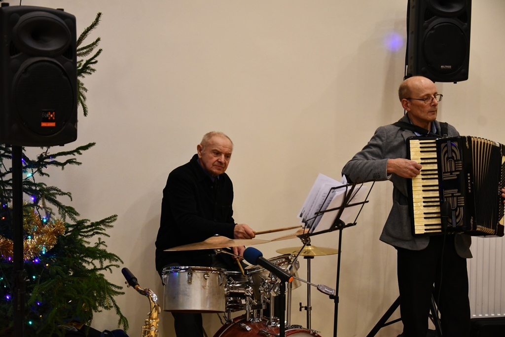 Kolejna część spotkania odbyła się w auli Wyższego Seminarium Duchownego w Drohiczynie. Tu dla wszystkich zgromadzonych, kolędy i pastorałki a także utwory karnawałowe zagrała kapela z terenu gminy Drohiczyn, której liderem jest pan Wiesław Harbaszewski, sołtys wsi Arbasy.