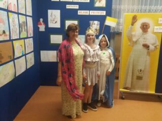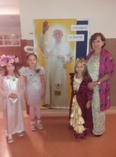 Kolejna część spotkania była wypełniona wspólnym śpiewaniem piosenek, tańcami i mini- konkursami, które prowadziła s. Katarzyna oraz wolontariusze z klas starszych.  Odbyło się też podsumowanie wcześniej zapowiedzianego konkursu na najładniejsze przebranie. Wyróżniono i nagrodzono szesnastu uczestników balu. Czas upływał w radosnej atmosferze. Każdy chętny mógł zrobić sobie zdjęcie ze św. Janem Pawłem II, stając przy Jego dużym wizerunku.