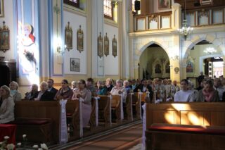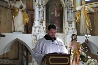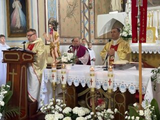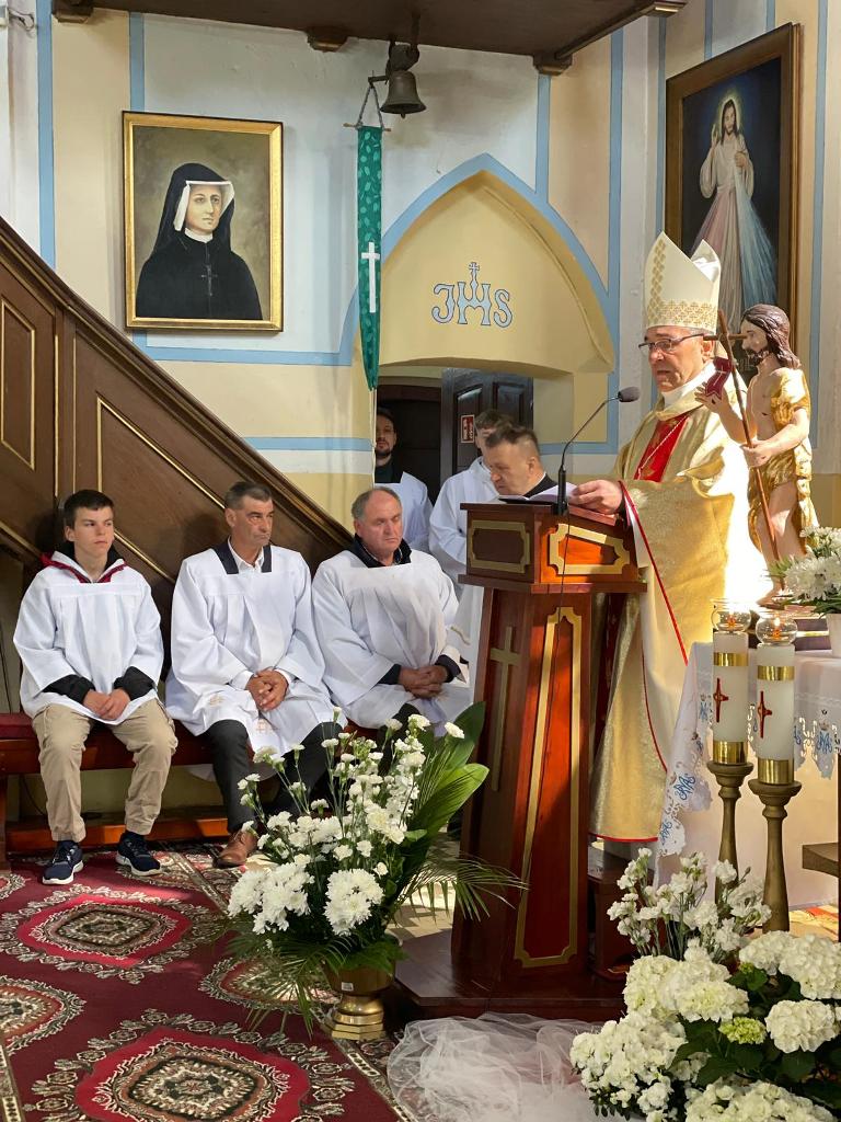 Biskup przewodniczył Mszy św. W homilii nawiązał do historii parafii, aktualnych czytań liturgicznych, a także do wyboru nowego Papieża Leona XIV, prosząc zgromadzonych o modlitwę za Ojca Świętego oraz o nowe i święte powołania kapłańskie i zakonne.