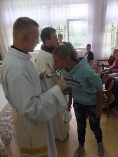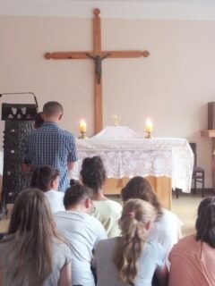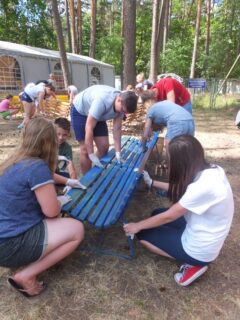 Oprócz tego wzięliśmy udział w szkole liturgicznej i namiocie spotkania. Dzień zakończyliśmy Adoracją Najświętszego Sakramentu podczas której można było skorzystać z Sakramentu Pokuty. Wtorek rozpoczęliśmy bardzo wcześnie pobudką o 4.30, po której udaliśmy się nad Bug aby odnowić nasze przyrzeczenia chrzcielne. „Pobierz i udostępnij” to temat trzeciego dnia, podczas którego uczyliśmy się czym jest wolontariat. W ramach ćwiczeń praktycznych zrobiliśmy coś dobrego i pożytecznego dla ośrodka NOE, w którym mieszkaliśmy – a mianowicie pomalowaliśmy ławki stojące na jego terenie. Czwarty dzień naszej przygody z KSMem rozpoczął się wspólną Eucharystią z uczestnikami 6 Rajdu dla Życia, których gościliśmy od wtorkowego wieczoru w Broku. Przemierzają rowerami całą Polskę promując postawy pro life i modląc się w intencji życia poczętego. Razem z nimi „podróżują” relikwie bł. Karoliny Kózkówny – patronki KSM. Środa przebiegła pod hasłem „Dołącz do sieci, czyli tworzymy wspólnotę”. Spróbowaliśmy swoich sił pływając w kajakach po Bugu, a także popołudniu braliśmy udział w team bulding, który nauczył nas współpracy w grupie. Przedostatni dzień naszego obozu był poświęcony Ojczyźnie. W trakcie obozu mogliśmy wziąć udział w podniebnym spacerze po linach w Parku Linowym NOE, oglądaliśmy zdjęcia wspominając 20 lat działalności KSM w naszej Diecezji, zorganizowaliśmy „patriotyczne” karaoke oraz wzięliśmy udział w patriotycznej grze terenowej. Codziennie braliśmy udział w Eucharystii podczas których słuchaliśmy krzepiących serce kazań ks. Andrzeja i ks. Łukasza. W spotkaniach w grupach poznawaliśmy na nowo KSM bądź odświeżaliśmy wiedzę która posiadaliśmy, rozważaliśmy fragmenty z Pisma Świętego wybrane na każdy dzień.