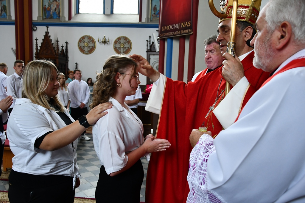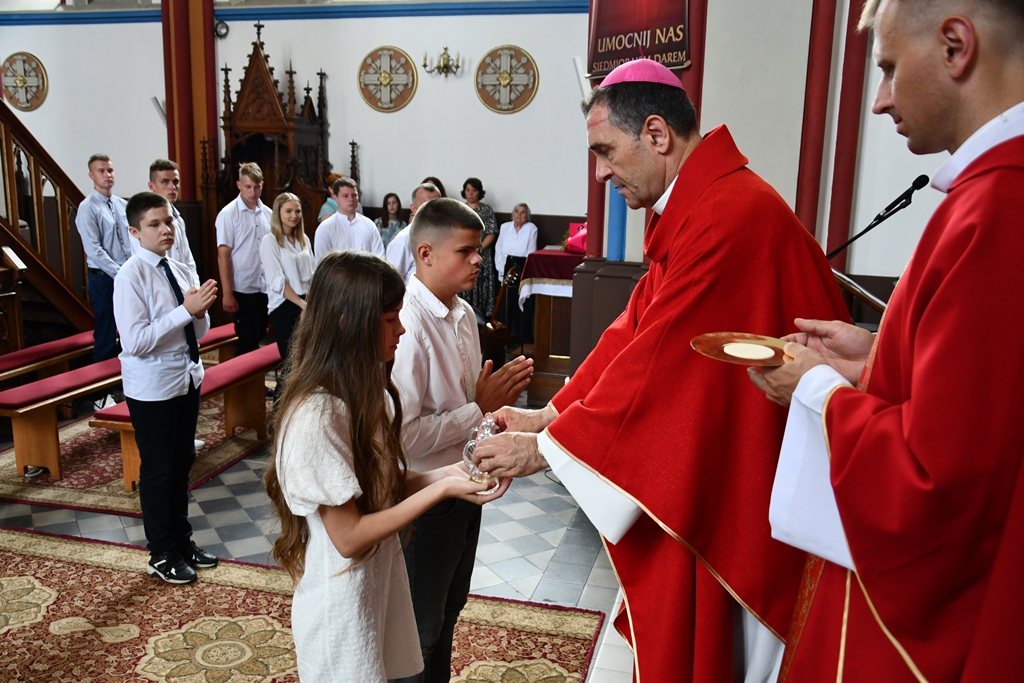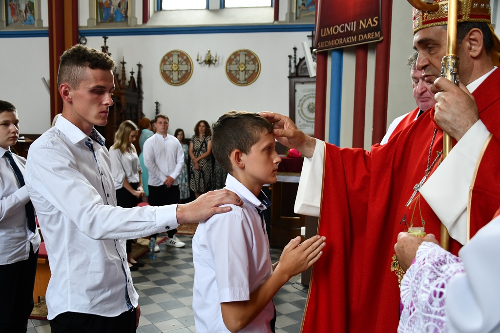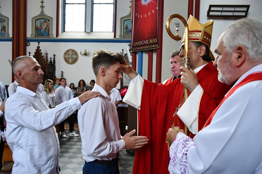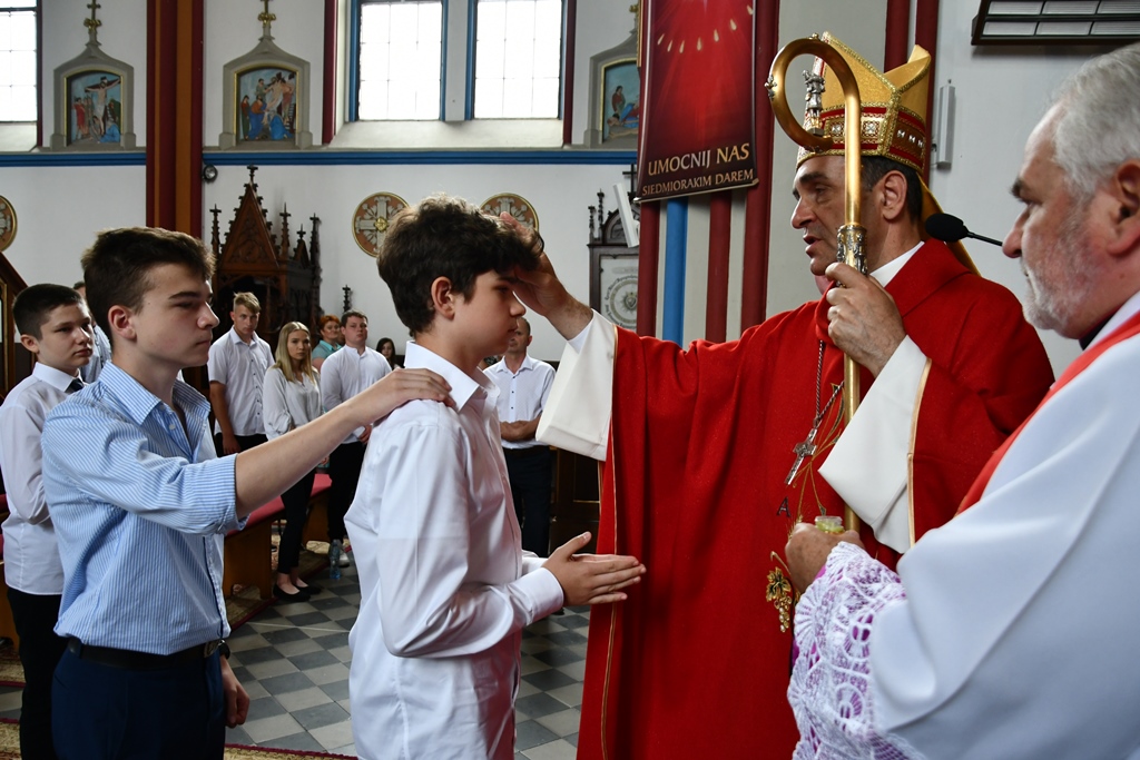 Podczas kolejnej Mszy św. pasterz diecezji siedemnastoosobowej grupie młodzieży udzielił sakramentu bierzmowania. Z prośbą o jego udzielenie zwrócili się przedstawiciele rodziców. Bierzmowani aktywnie uczestniczyli w liturgii. Na Eucharystii był obecny ks. kan. kmdr por. Witold Kosiński. Młodzież podziękowała biskupowi za udzielenie sakramentu. Po Mszy św. biskup spotkał się z Radą Parafialną.
