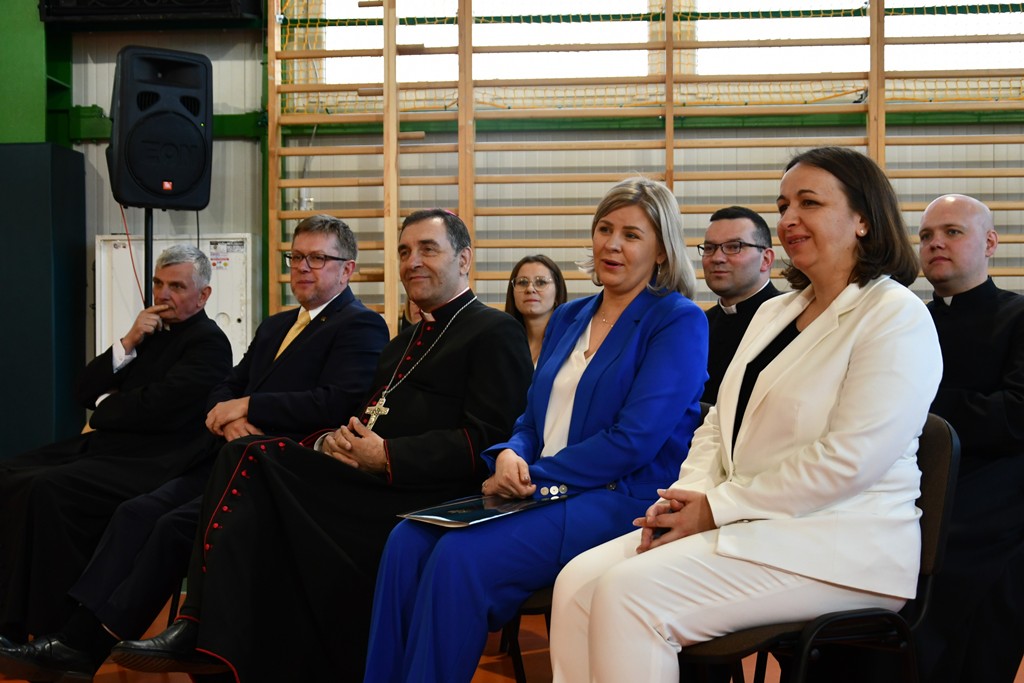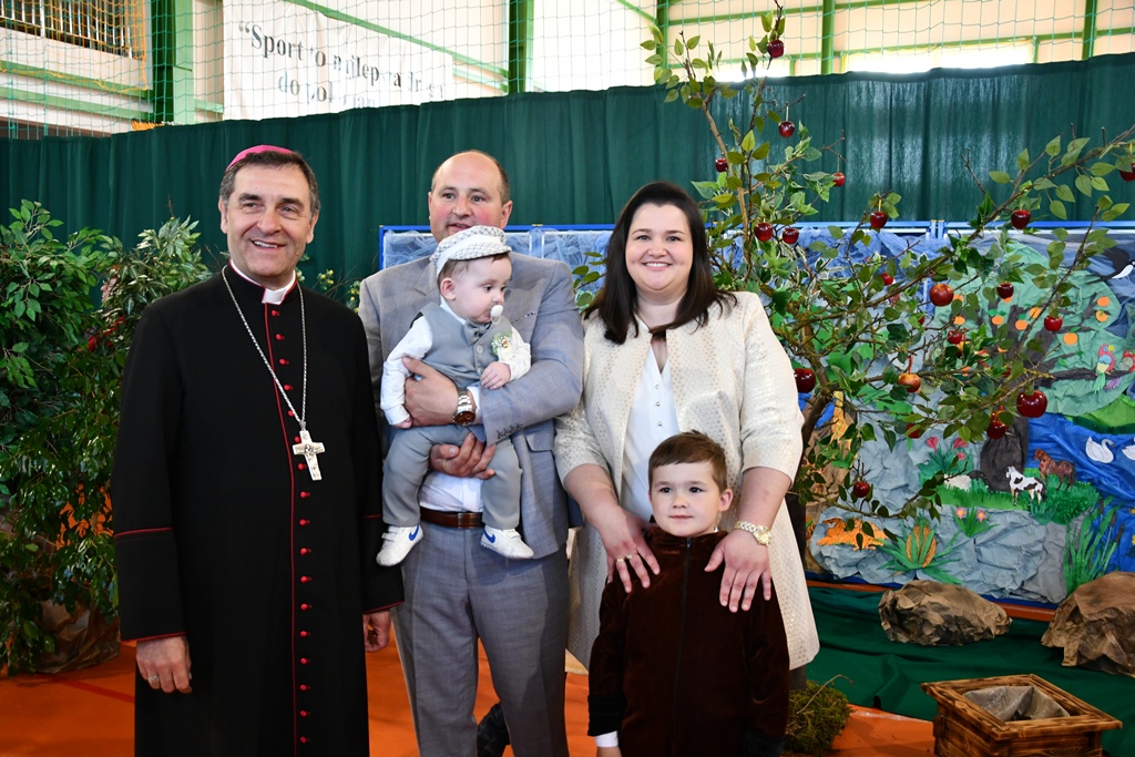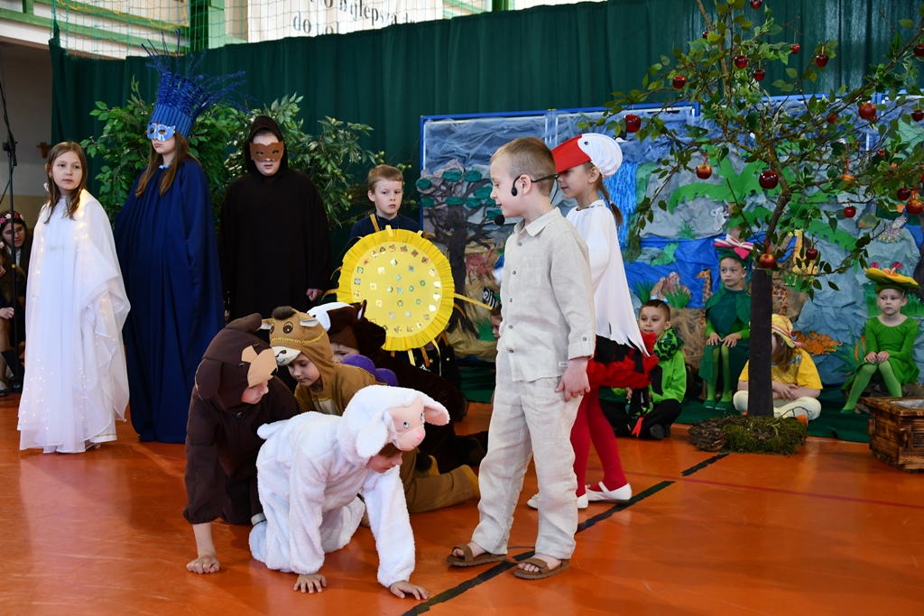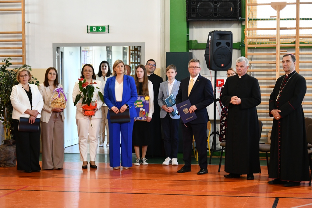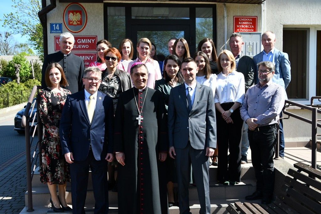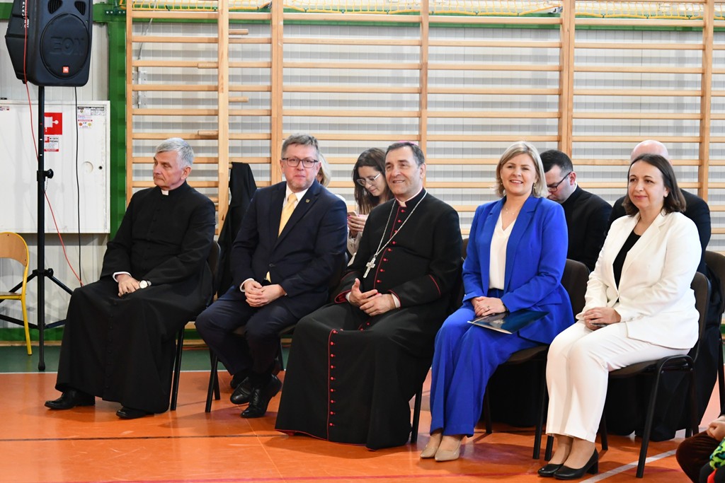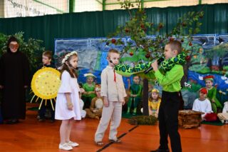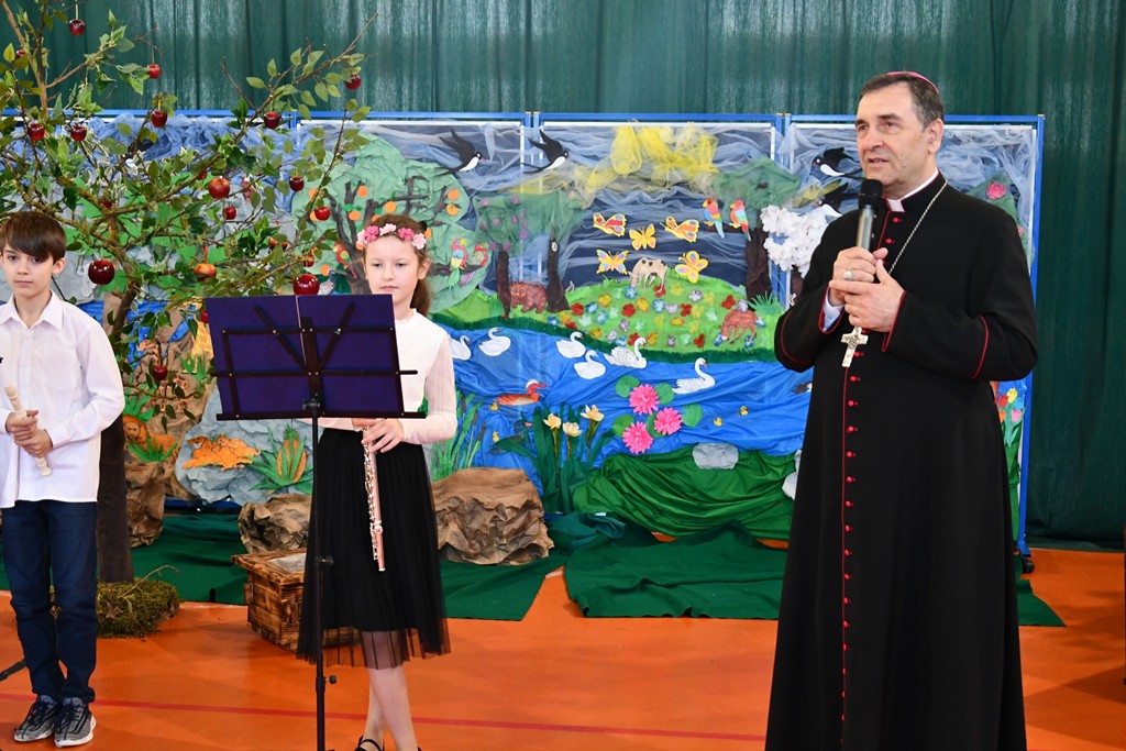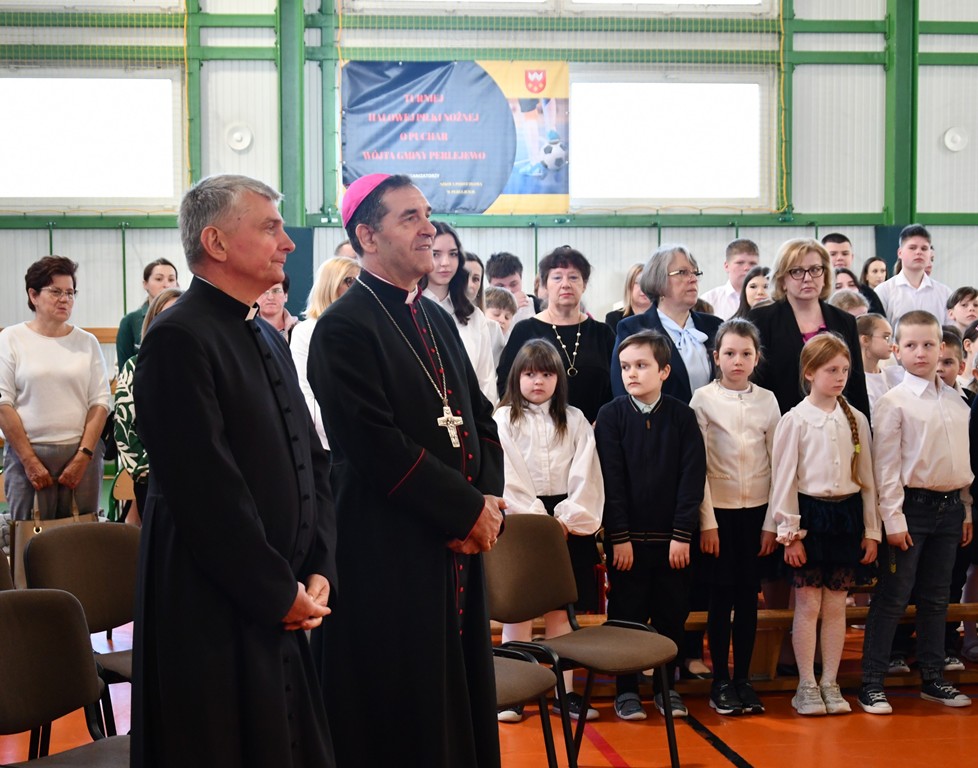 Kolejny dzień wizytacji rozpoczęły odwiedziny Szkoły Podstawowej. Słowa powitania skierował wójt gminy Perlejewo Jakub Wierzbicki, przedstawicie uczniów, rodziców oraz dyrekcja Szkoły. Aneta Leszczyńska – dyrektor Szkoły – zaprosiła wszystkich do obejrzenia części artystycznej zatytułowanej „Z prochu i żebra”. Bogata i starannie przygotowana scenografia, dopracowane stroje a przede wszystkim profesjonalna zaangażowanie i gra małych artystów przeniosła wszystkich do momentu stworzenia świata i powołania do istnienia człowieka. Ciekawymi tekstami i utworami muzycznymi artyści ukazali ponadczasową wartość rodziny. Spektakl został przygotowany pod czujnym okiem Lilii Wojtkowskiej przy współpracy wielu osób. Wystąpiła również schola oraz zespół muzyczny przygotowany pod kierunkiem Łukasza Kraujutowicza. Biskup wyraził radość i wdzięczność za przygotowanie tak imponującego przedstawienia. Udzielił zebranym pasterskiego błogosławieństwa. Nie zabrakło także czasu na rozmowę z gronem pedagogicznym.