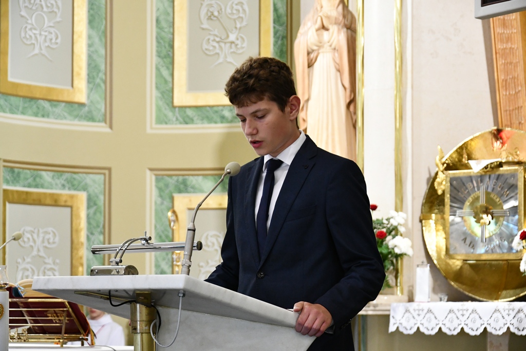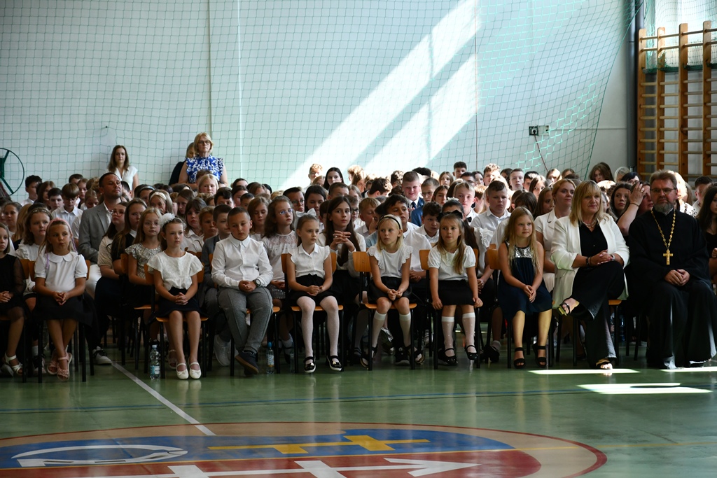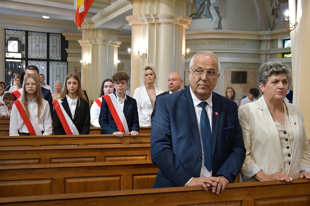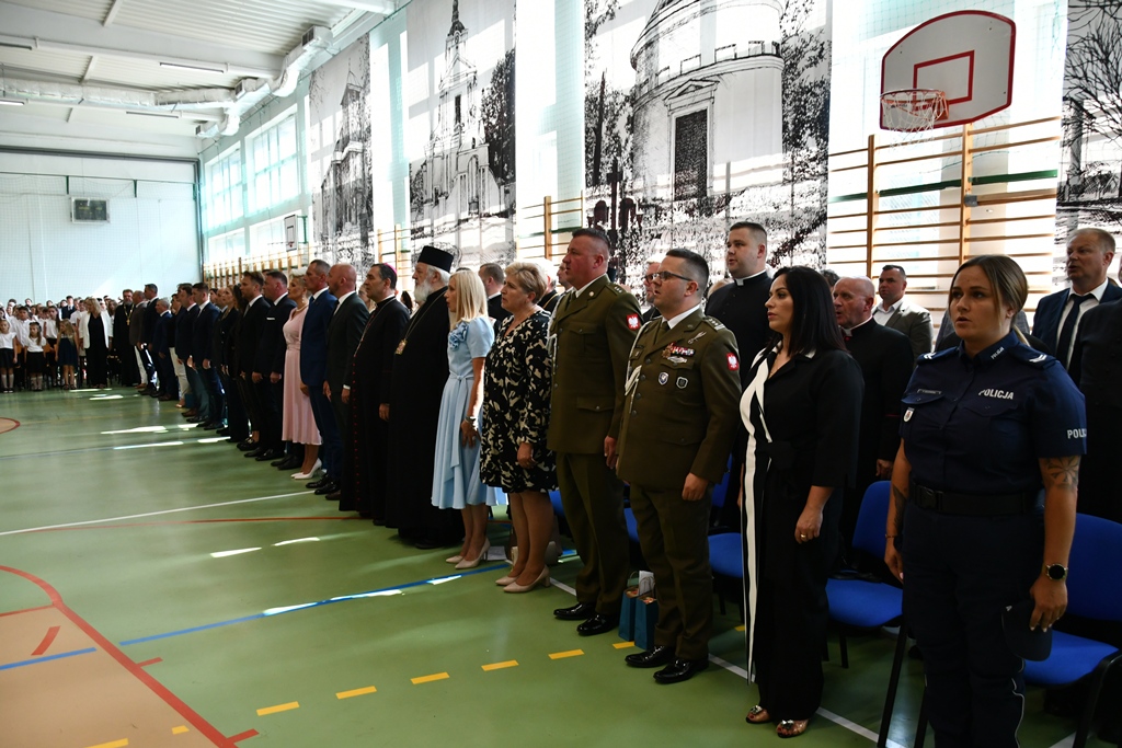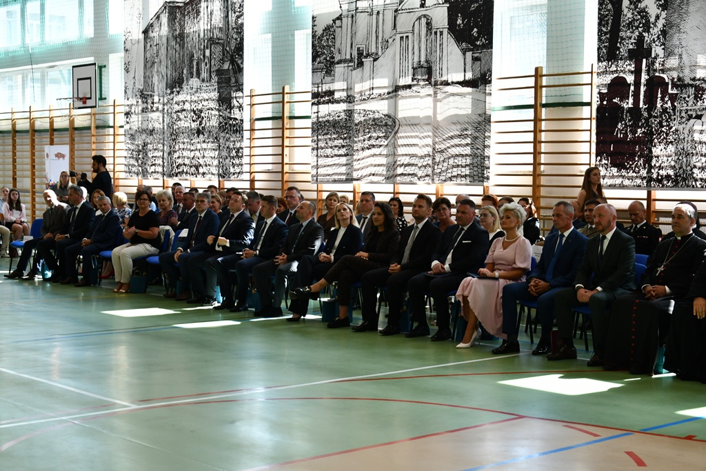 Przybyłych gości powitał miejscowy proboszcz ks. kan. Bohdan Sawicki. Podkreślił obecność duchowieństwa, władz parlamentarnych, oświatowych, samorządowych, służb mundurowych oraz pocztów sztandarowych.