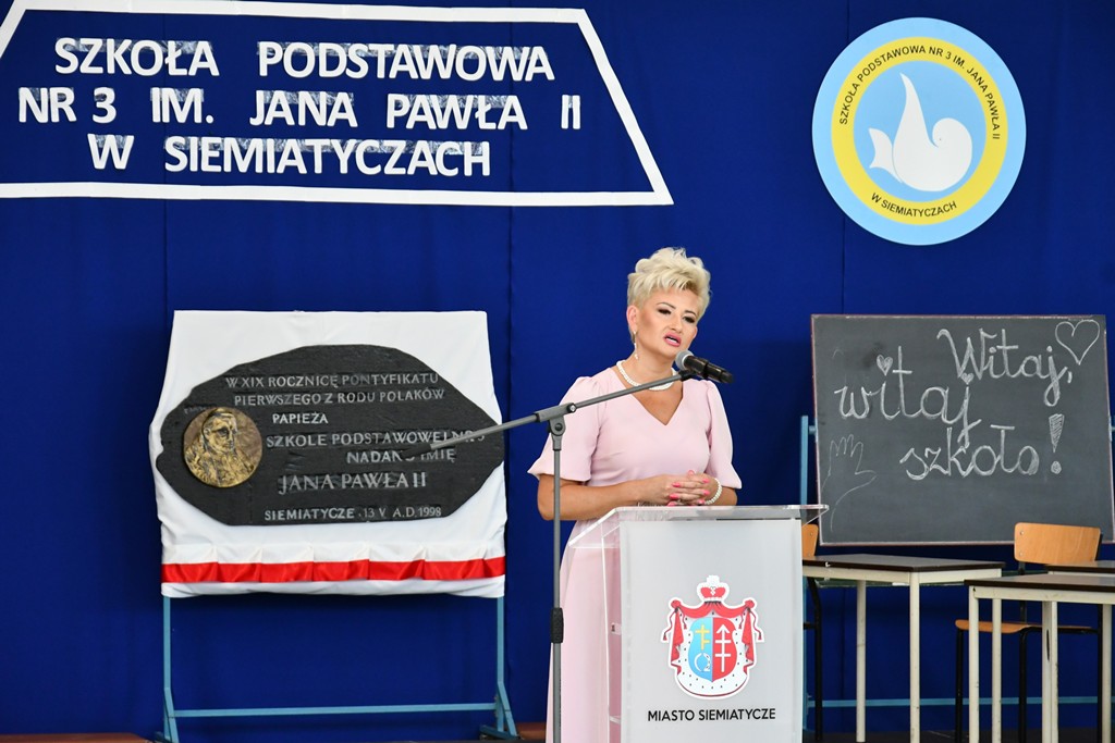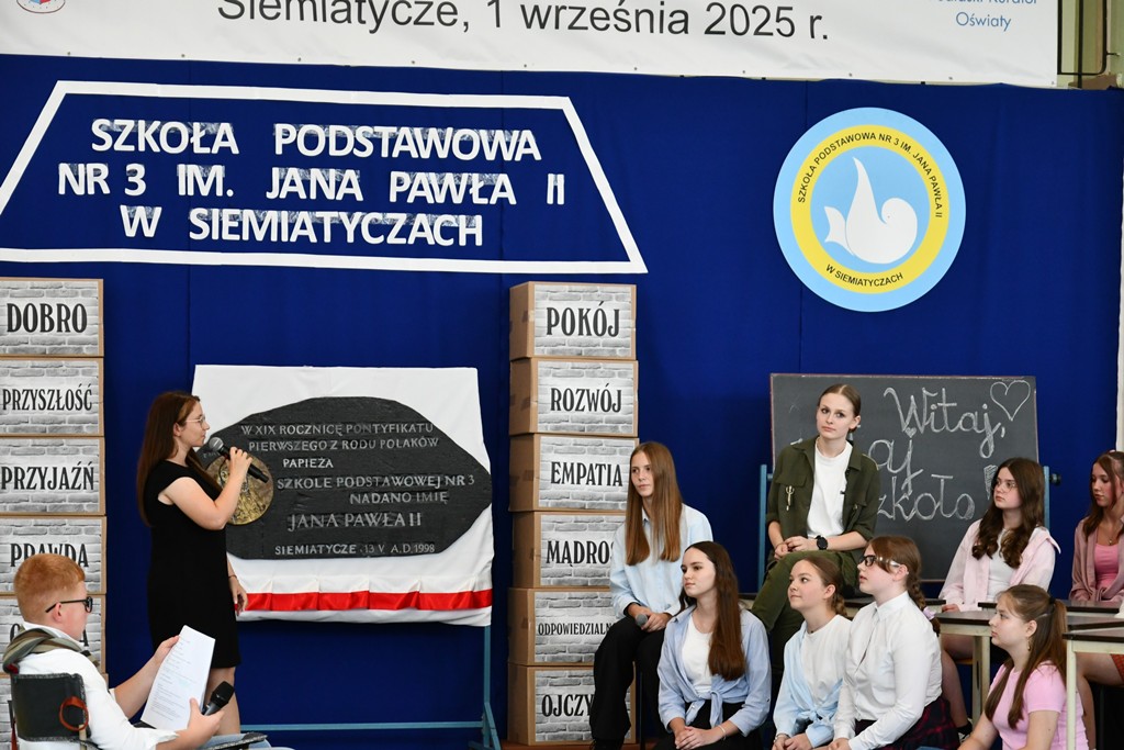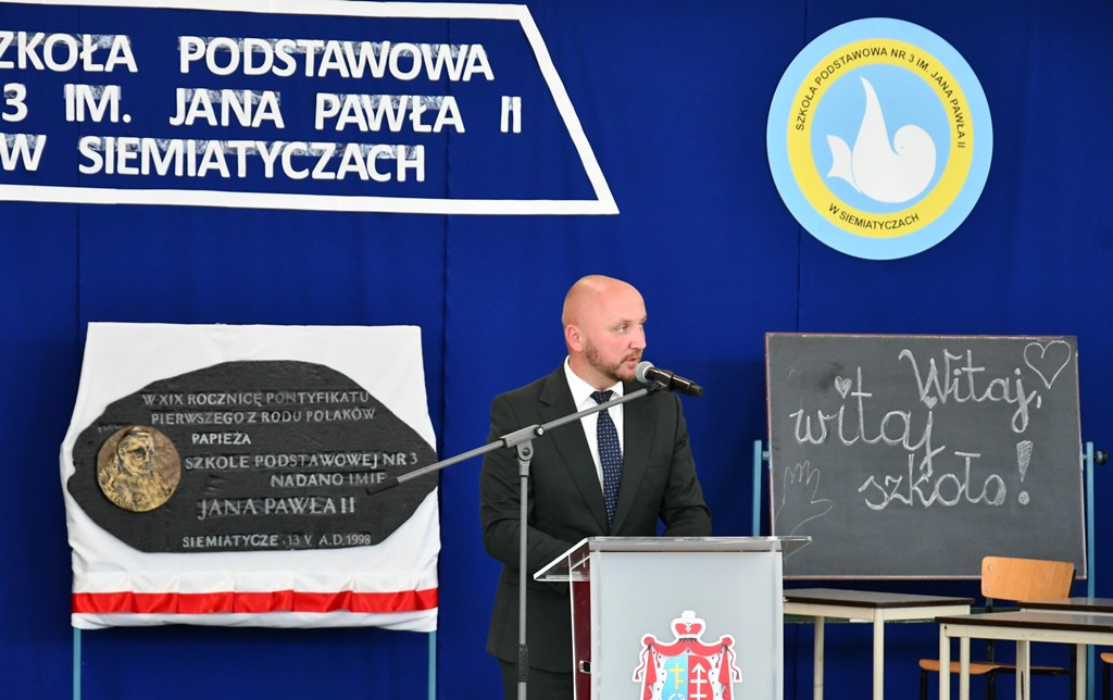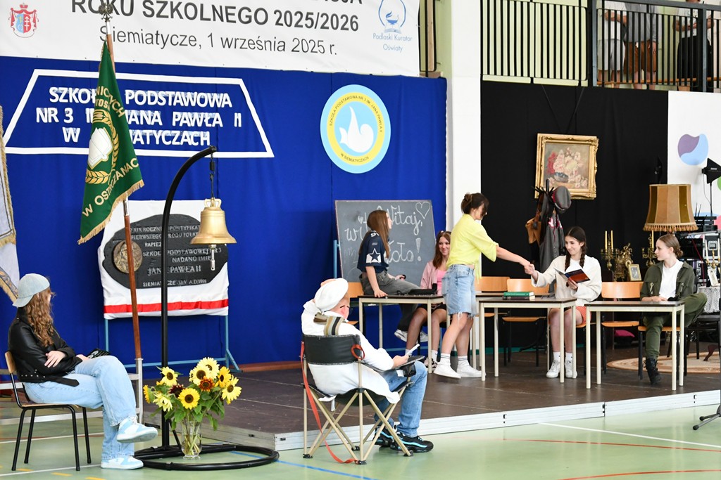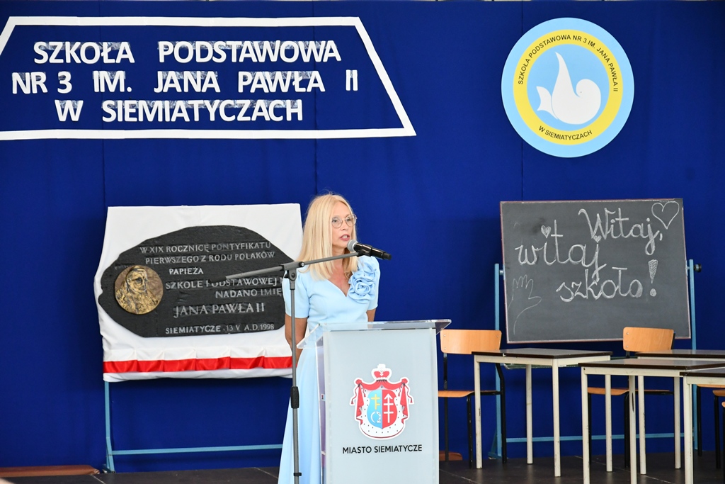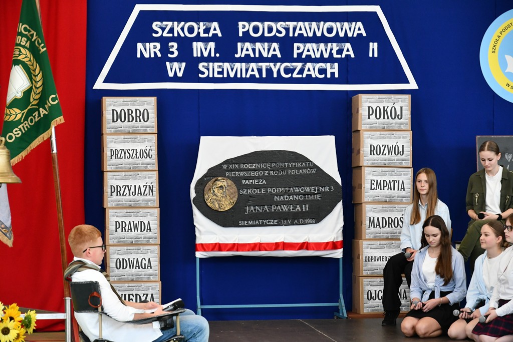 Druga część spotkania miała miejsce na hali sportowej przy Szkole Podstawowej nr 3 im. Jana Pawła II w Siemiatyczach. Po dośpiewaniu Hymnu Państwowego i powitaniu gości nadszedł czas na okolicznościowe przemówienia. Na uwagę zasługuje część artystyczna przygotowana przez uczniów i nauczycieli szkoły. Ukazali w niej jak przeszłość łączy się i wpływa na teraźniejszość. Zaprezentowali wartości, w oparciu o które pragną kształtować swoje przyszłe życie. Przywołali także postać patrona szkoły św. Jana Pawła II oraz odnieśli się do jego nauczania.