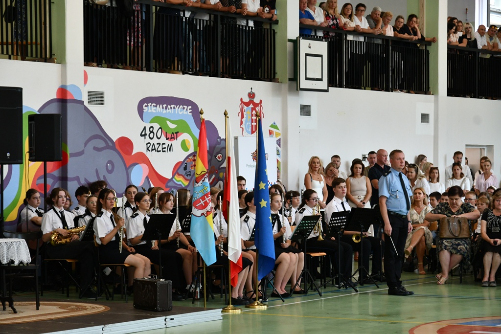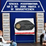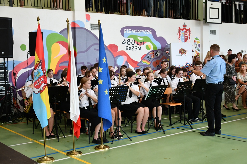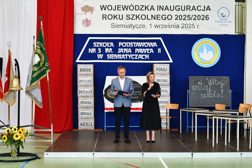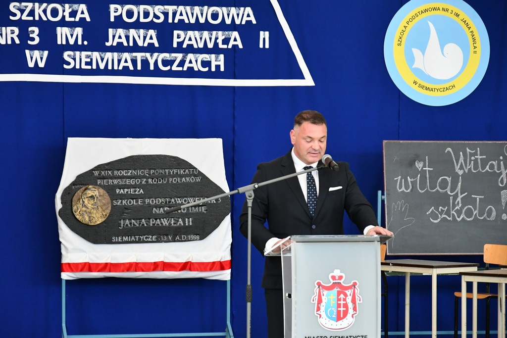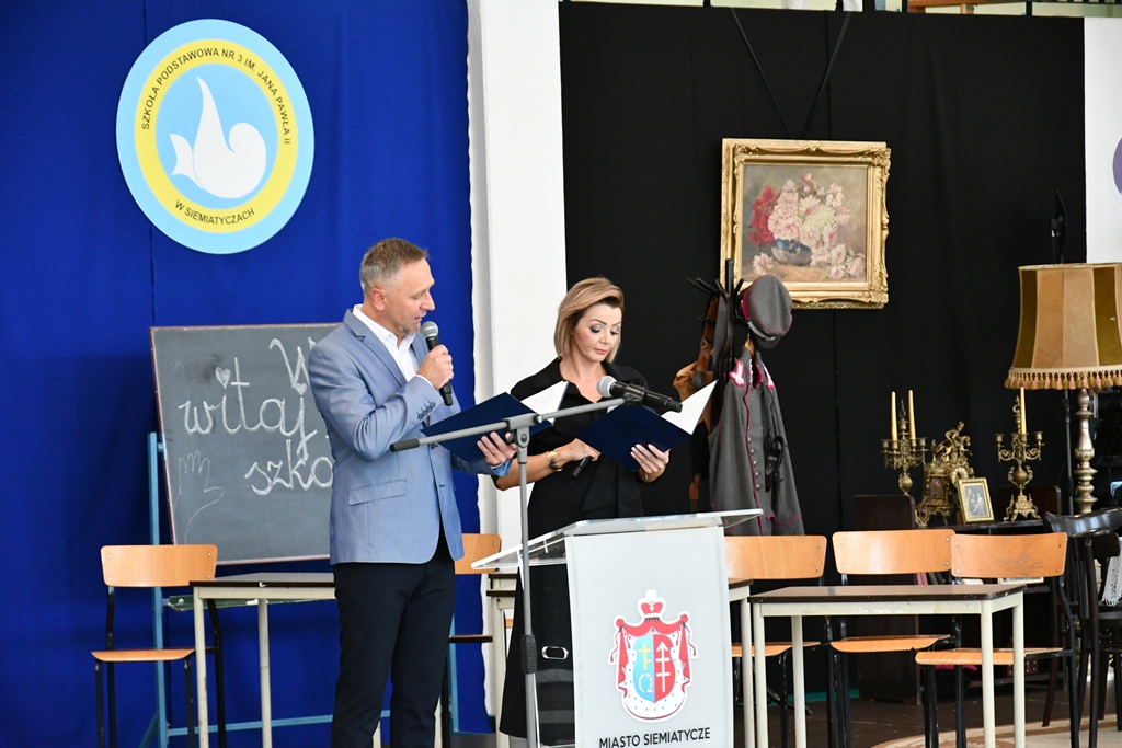 Druga część spotkania miała miejsce na hali sportowej przy Szkole Podstawowej nr 3 im. Jana Pawła II w Siemiatyczach. Po dośpiewaniu Hymnu Państwowego i powitaniu gości nadszedł czas na okolicznościowe przemówienia. Na uwagę zasługuje część artystyczna przygotowana przez uczniów i nauczycieli szkoły. Ukazali w niej jak przeszłość łączy się i wpływa na teraźniejszość. Zaprezentowali wartości, w oparciu o które pragną kształtować swoje przyszłe życie. Przywołali także postać patrona szkoły św. Jana Pawła II oraz odnieśli się do jego nauczania.