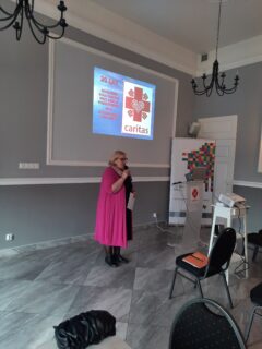 Zebranych gości powitał dyrektor Caritas Diecezji Drohiczyńskiej, który przedstawił główne cele spotkania oraz funkcjonowania Szkolnych Kół Caritas. Następnie wszyscy zapoznali się z prezentacją wieloletniego opiekuna SKC ze Szkoły Podstawowej nr. 6 im. Pawła Kamińskiego Jolanty Celińskiej, która opowiedziała o działalności charytatywnej i o wolontariuszach, którzy są absolwentami i dalej włączają się w dzieło niesienia pomocy.