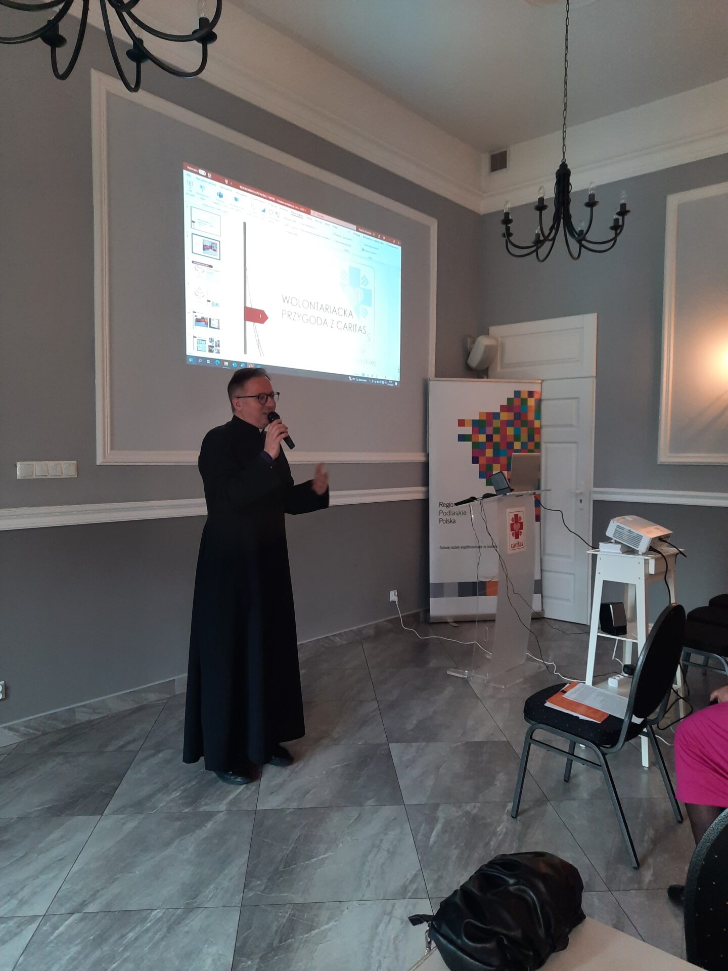 Zebranych gości powitał dyrektor Caritas Diecezji Drohiczyńskiej, który przedstawił główne cele spotkania oraz funkcjonowania Szkolnych Kół Caritas. Następnie wszyscy zapoznali się z prezentacją wieloletniego opiekuna SKC ze Szkoły Podstawowej nr. 6 im. Pawła Kamińskiego Jolanty Celińskiej, która opowiedziała o działalności charytatywnej i o wolontariuszach, którzy są absolwentami i dalej włączają się w dzieło niesienia pomocy.