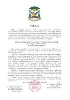 Treść dekretu odczytał wikariusz generalny ks. prał. Tadeusz Syczewski w obecności kanclerza Kurii Diecezjalnej ks. prał. Zbigniewa Rostkowskiego oraz wice ekonoma ks. kan. Piotra Jurczaka. Ks. Biskup osobiście wręczył dekret ksieni zakonu s. Bogumile, która przybyła wraz z s. Franciszką.
