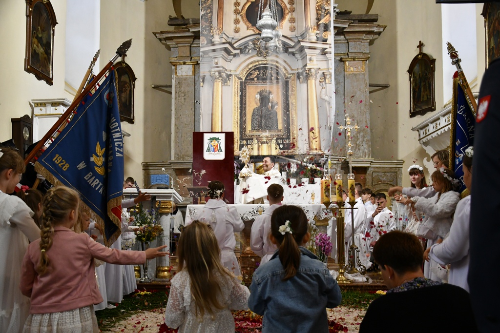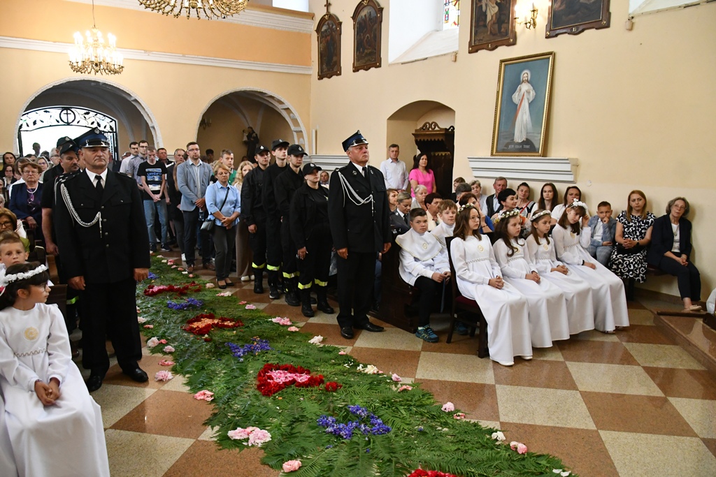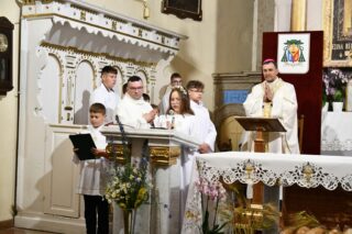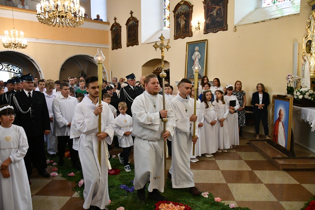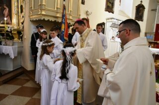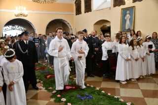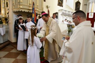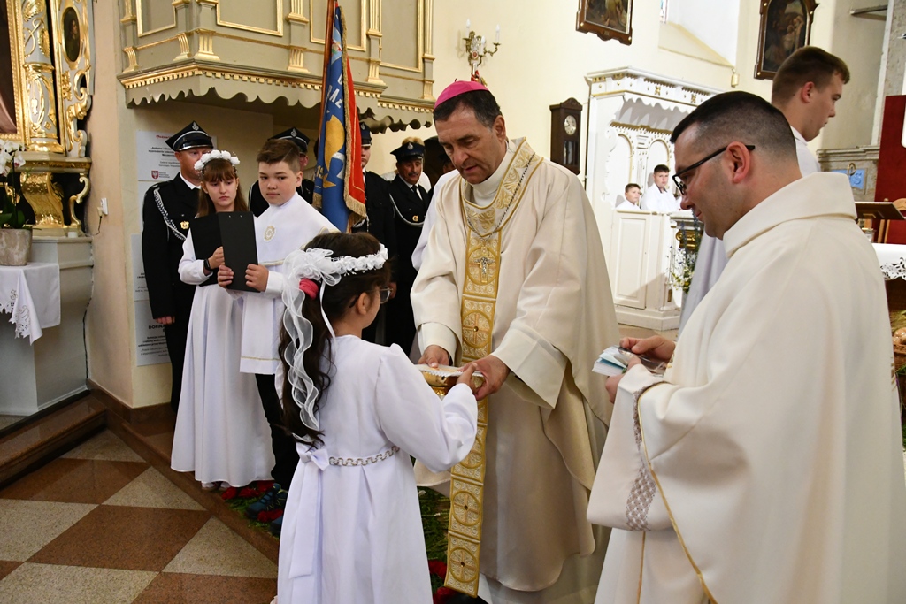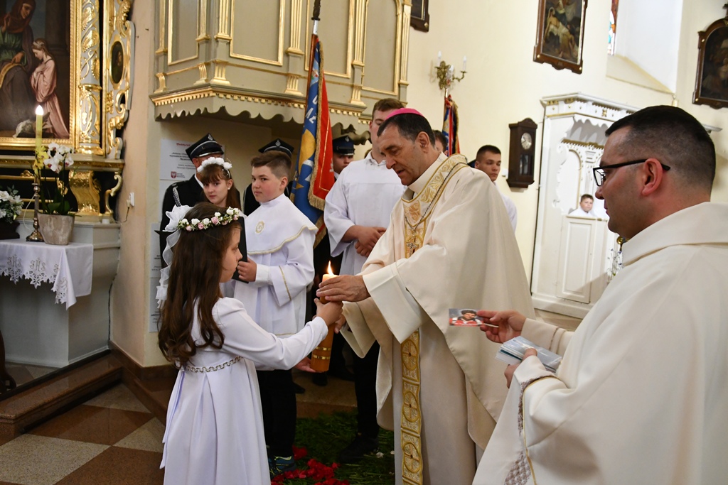 Słowo powitania skierował miejscowy proboszcz ks. kan. Antoni Klukowski. Wyraził radość z obecności biskupa w tak ważnym dniu dla całej wspólnoty parafialnej. Podkreślił obecność kapłanów, sióstr zakonnych, służb mundurowych, dzieci pierwszokomunijnych, również tych, które obchodziły rocznicę Pierwszej Komunii Świętej oraz parafian i przybyłych gości.