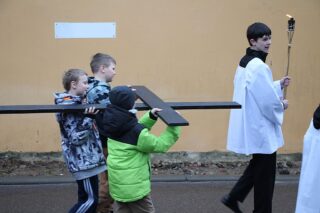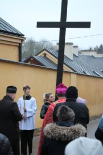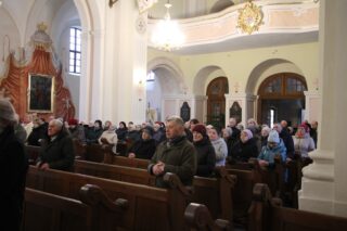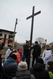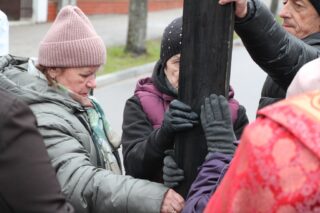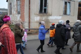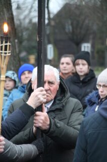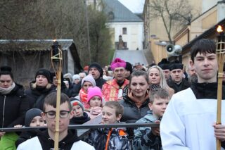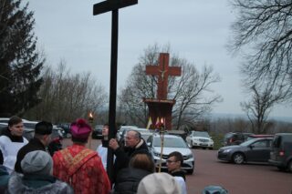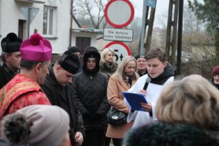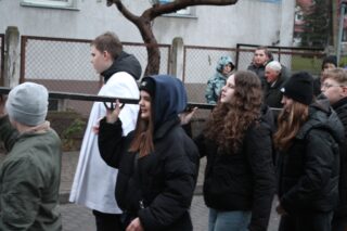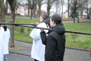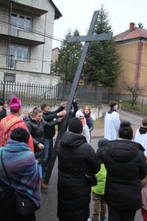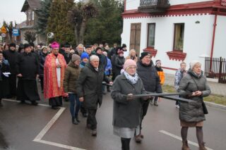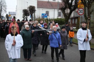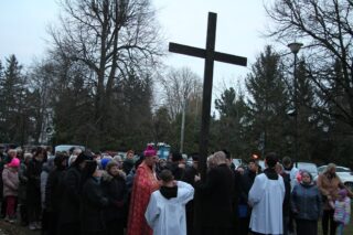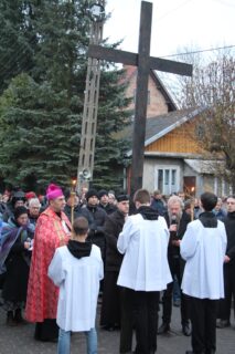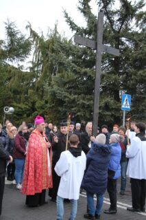 Nabożeństwu przewodniczył ksiądz bp Piotr Sawczuk. Krzyż niesiony był przez grupy związane z parafią.
