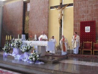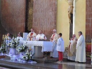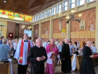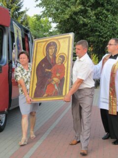 W sobotę, 8 sierpnia Krzyż i Ikona Matki Bożej odwiedziły kolejno wszystkie parafie należące do dekanatu łochowskiego. Wieczorem zaś ponownie zostały przewiezione do parafii  Niepokalanego Serca Najświętszej Maryi Panny w Łochowie, gdzie o godz. 18.00 odprawiona została Msza święta, celebrowana przez bp. Tadeusza Pikusa Ordynariusza Drohiczyńskiego. W wygłoszonym Słowie Bożym biskup zwrócił uwagę na kierunek, jaki człowiek obiera w życiu. Jak wyjaśnił Pasterz Diecezji Drohiczyńskiej nie mamy wpływu na to, jak rozpoczynamy nasze życie, ale to od nas zależy jak je przeżyjemy i którą z dróg wybierzemy. Pojawia się zatem pytanie – czy droga przez nas wybrana wpisuje się w drogę do życia wiecznego, do Chrystusa? Biskup nawiązał także do symboli Światowych Dni Młodzieży wyjaśniając ich znaczenie i przesłanie, jakie ze sobą niosą.  Po Eucharystii kapłani i wierni pożegnali symbole, a te w eskorcie motocyklistów ruszyły w kolejną podróż – tym razem do diecezji warszawsko-praskiej.