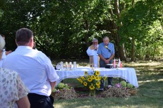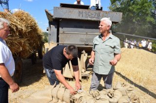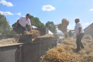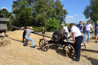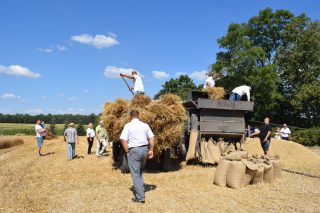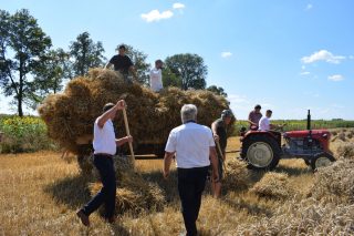 Kolejnym punktem był pokaz koszenia snopowiązałką, zestawianie snopków, zwożenie ich wozem i młócenie pszenicy. Zarówno Gospodarze jak i Goście brali czynny udział w żniwach. Pokaz przy użyciu tradycyjnych sprzętów i narzędzi rolniczych pochodzących ze zbiorów Państwa Krasnodębskich cieszył się dużym zainteresowaniem. Po zakończonych pracach na zgromadzonych czekały wiejskie pyszności. Aby tradycji stało się zadość, na świeżym powietrzu był czas na wspólne rozmowy.